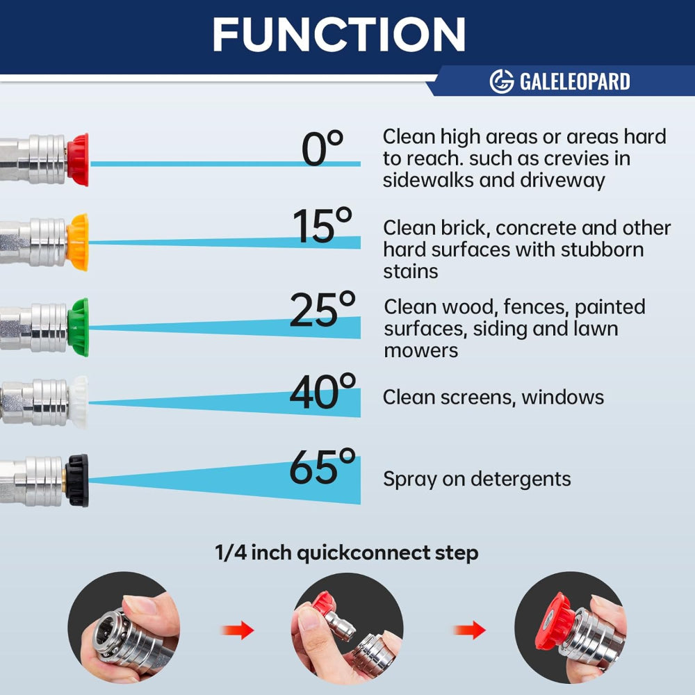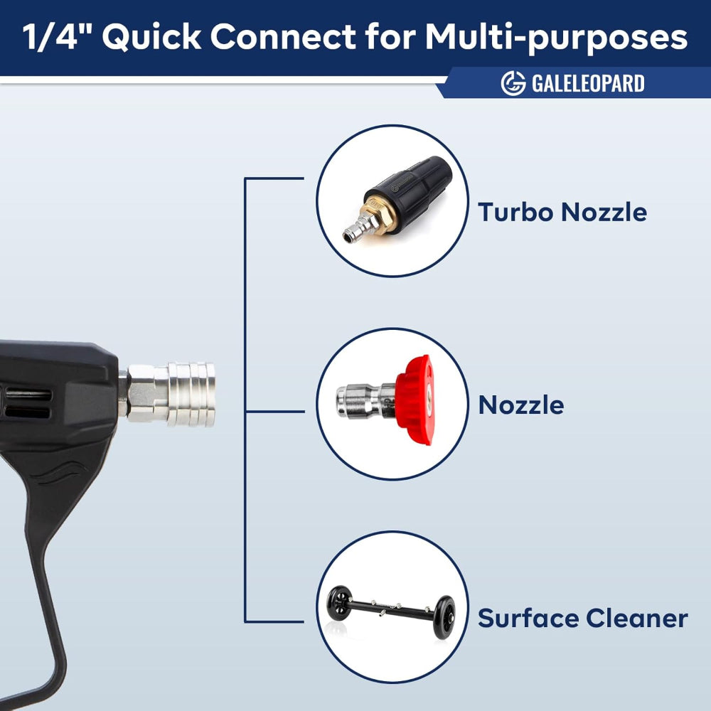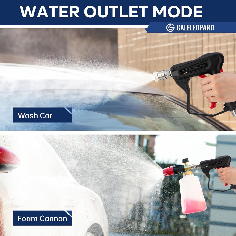 High Pressure Washer Gun – 4350 PSI Short Spray Gun with 5 Nozzles & Quick Connect Fittings - Upgrade your cleaning setup with this high pressure washer gun designed for powerful and precise performance. Capable of handling up to 4350 PSI, this short spray gun delivers strong, controlled water flow for cars, driveways, patios, and outdoor surfaces. The included 5 spray nozzle tips allow you to switch between pressure levels for different cleaning tasks. Featuring a 1/4" quick connector along with 3/8'' and M22-14/15mm fittings, it ensures wide compatibility with pressure washers and foam cannons. Built for durability and ease of use, this compact tool makes heavy-duty cleaning faster and more efficient.