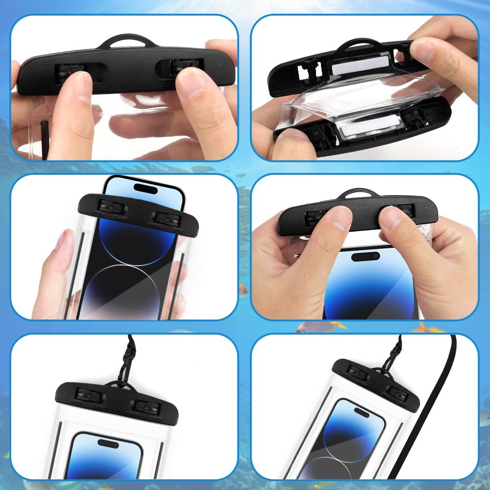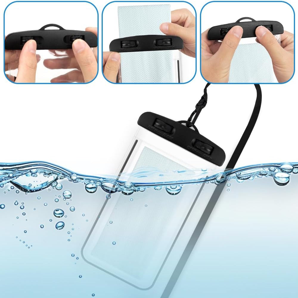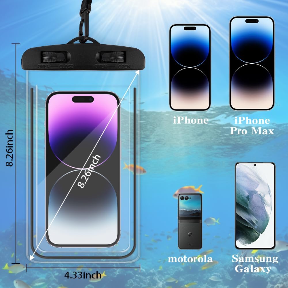 • Two-Pack Protection – Includes 2 black-rimmed waterproof pouches (4.2" x 8.2") to fit most phones, with or without cases, for double security.