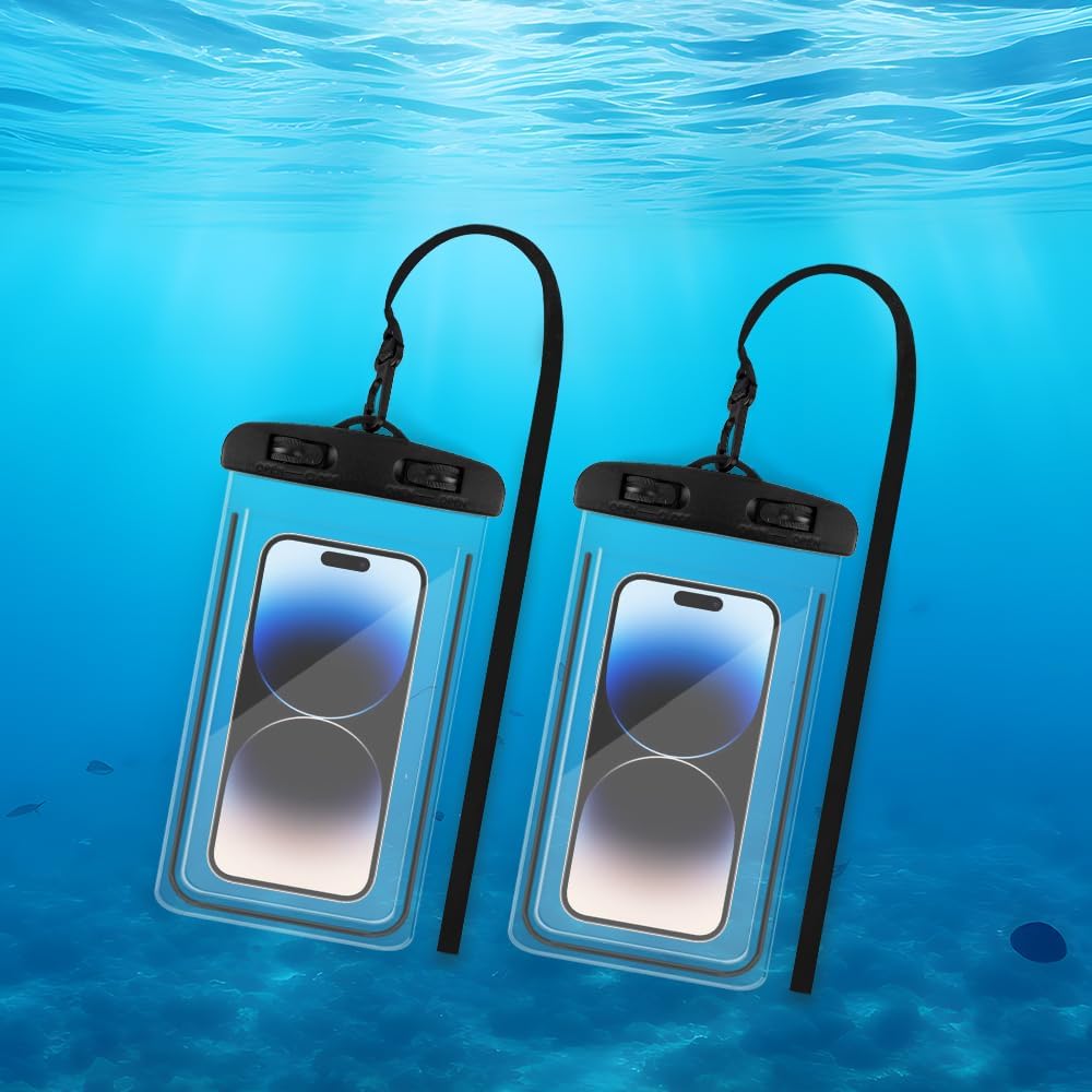 2-Pack Waterproof Phone Pouch – Wet & Dry Cell Phone Case for Beach, Vacation, Waterpark, Cruise, Underwater, Travel Essentials for Men & Women - Keep your phone safe and accessible with this 2-Pack Waterproof Phone Pouch – perfect for travel, beach days, and water adventures. Each pouch measures 4.2 × 8.2 inches, fitting most phones with or without cases, and features a reliable manual sealing device for a secure, waterproof closure. Made from upgraded transparent TPU material, the pouch allows full touch screen functionality, fingerprint unlock, and face unlock while protecting your device. With 3-layer dustproof technology, it guards against water, snow, sand, and dirt, keeping your phone completely dry. Each pouch comes with a detachable 17-inch lanyard for easy carrying around your neck, making it an essential accessory for swimming, snorkeling, kayaking, rafting, or even showering with your phone nearby.