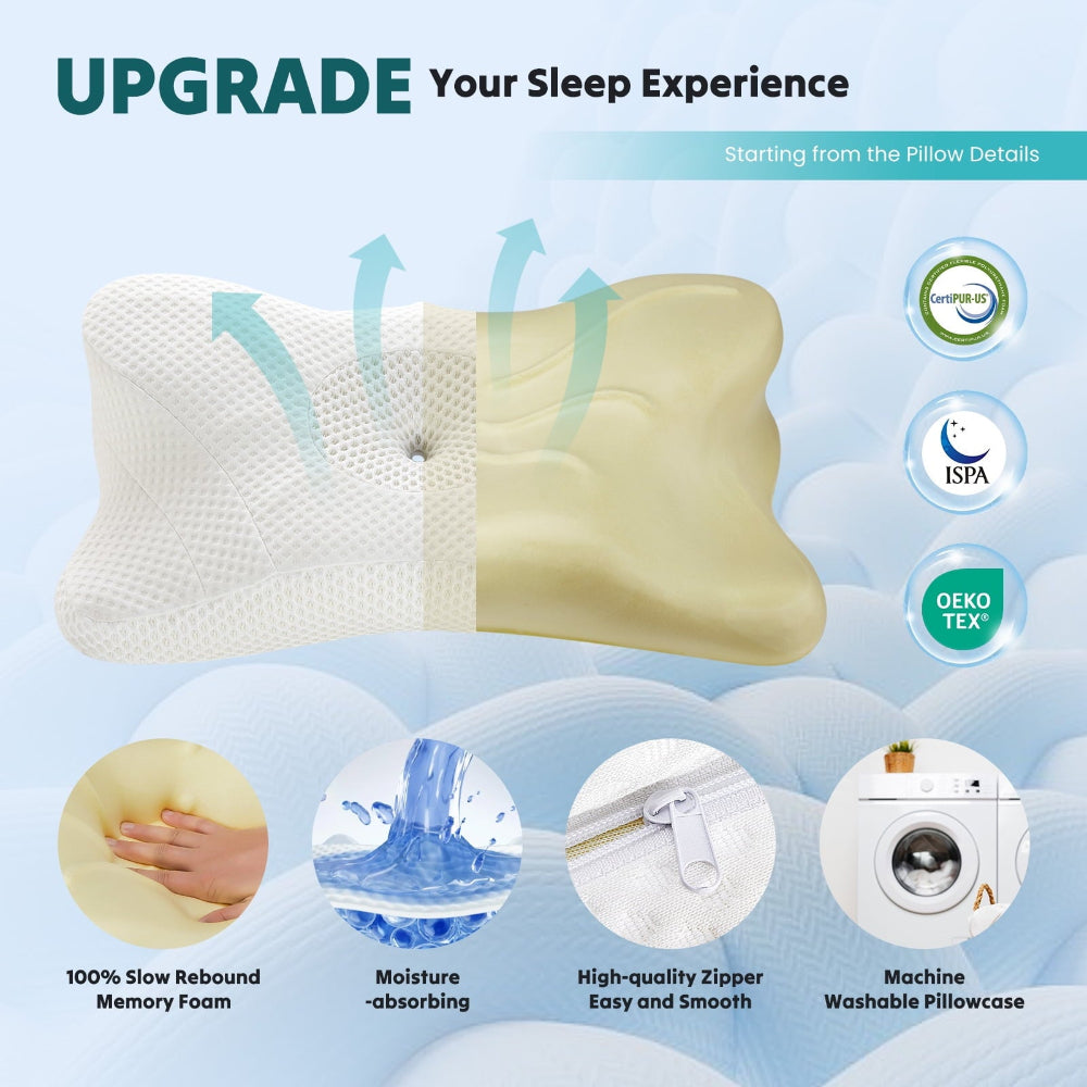 2-Pack Cervical Memory Foam Pillows – Ergonomic Contour Neck Support, Cooling Cover - Improve your sleep quality with this 2-piece set of ergonomic cervical memory foam pillows designed to support the neck and shoulders throughout the night. The contour orthopedic design helps align the spine while reducing pressure that can lead to neck and shoulder discomfort. Made with high-density memory foam, these pillows adapt to your head and neck shape for personalized comfort and support. The breathable cooling cover promotes airflow to help regulate temperature and maintain a fresh sleeping environment. A removable and washable cover makes cleaning simple while maintaining hygiene. Perfect for back and side sleepers, these queen-size pillows combine comfort, support, and durability for restful sleep.