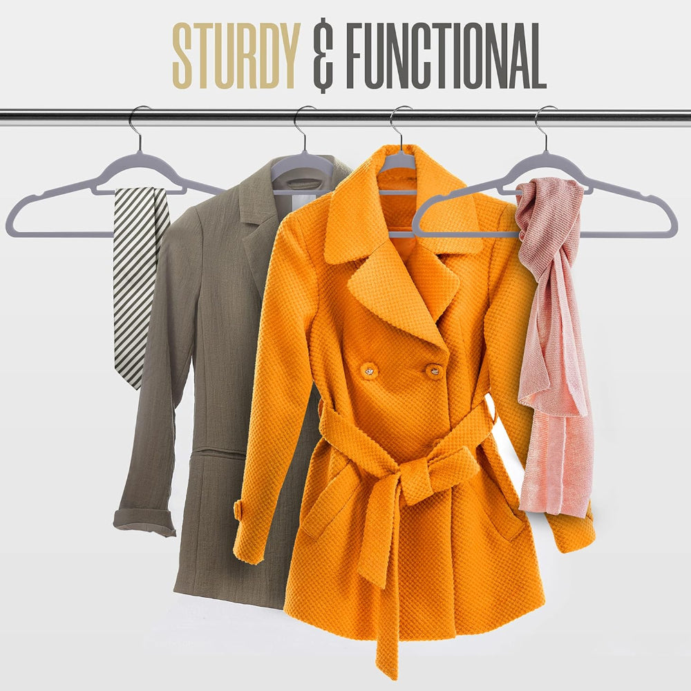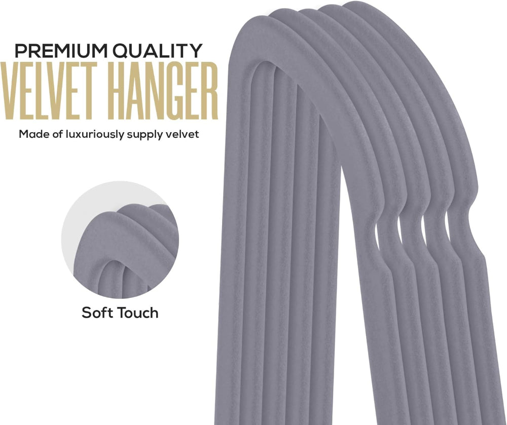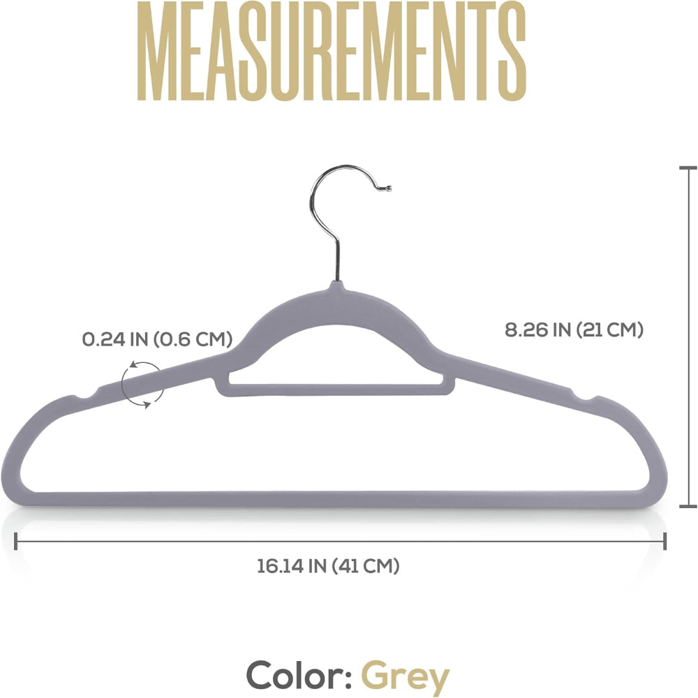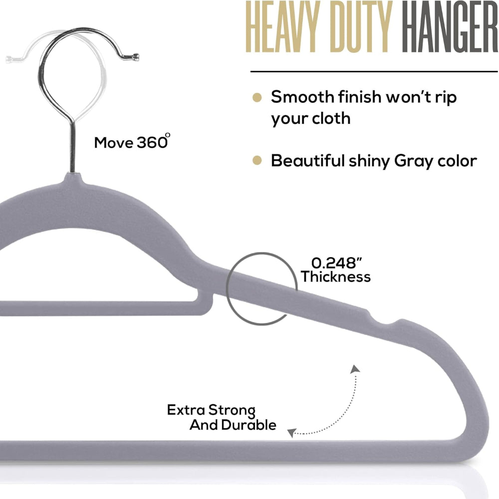 20-Pack Velvet Clothes Hangers – Non-Slip Use with Tie Bar – Heavy Duty Coat Hanger – 360° Rotatable Hook – Grey Finish - Keep your wardrobe organized and stylish with this set of elegant Velvet Clothes Hangers, each measuring 16.14 x 0.24 x 8.26 inches and crafted from sturdy ABS material capable of holding up to 10 pounds. The slim, 360-degree rotating design adds sophistication while maximizing closet space and creating a neat, minimalist look. Featuring a strong metallic hook with a refined chrome finish, these hangers combine durability with elegance. The soft velvet coating prevents clothes from slipping, keeping suits, pants, and delicate blouses wrinkle-free and securely in place for your everyday fashion needs.