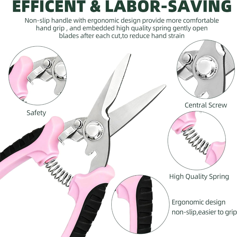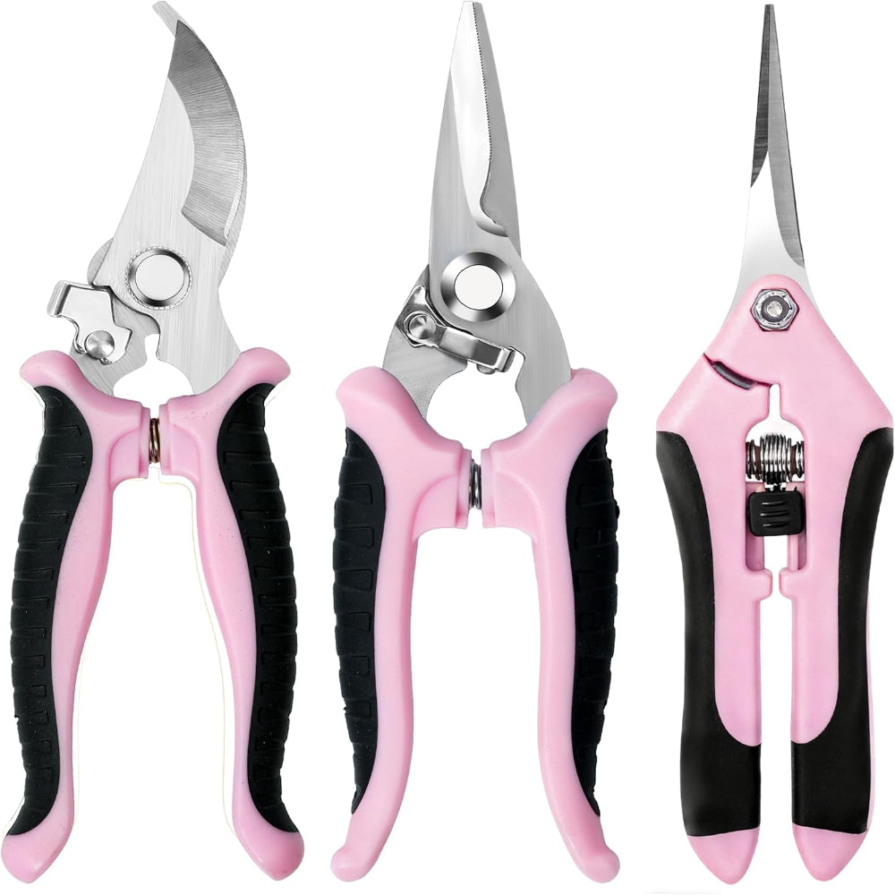 3-Pack Garden Pruning Shears – Stainless Steel Gardening Shears, Scissors, Clippers & Snips for Yard and Garden - This versatile pruning shears set is designed for safety, comfort, and efficiency in all your gardening tasks. Featuring a secure safety lock, the sharp blades remain closed when not in use, reducing the risk of accidental injuries. The set includes three different blades, making it ideal for trimming flowers, plants, bonsai, herbs, hydroponics, and light branches, and it also makes a thoughtful gift for gardening enthusiasts. Ergonomically designed with high-purity PP+TPR plastic handles, these shears offer a comfortable, non-slip grip for precise cutting. Attention: The blades are very sharp and should be kept out of reach of children.