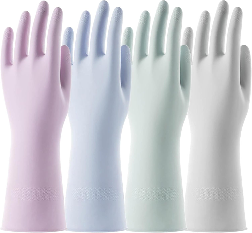 4-Pair Rubber Cleaning Gloves – Reusable Waterproof Kitchen & Bathroom Gloves with Flock Lining, Anti-Slip Grip, Thick Durable Long-Lasting Dishwashing Gloves, Colorful - These reusable rubber cleaning gloves come in a 4-pair set, designed for washing dishes and household cleaning tasks in the kitchen or bathroom. Made from durable, waterproof rubber, they feature a thick construction for long-lasting use and a comfortable flock lining for added softness. The gloves provide an anti-slip grip to handle wet or soapy items securely, while their colorful design adds a fun touch to everyday chores. Ideal for protecting hands from hot water, detergents, and grime, these gloves make dishwashing and cleaning easier and more efficient.