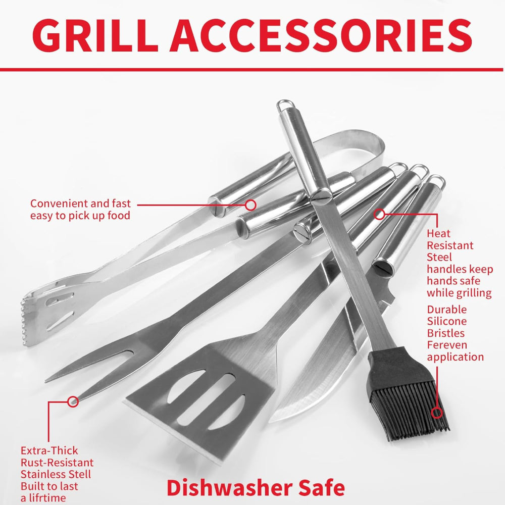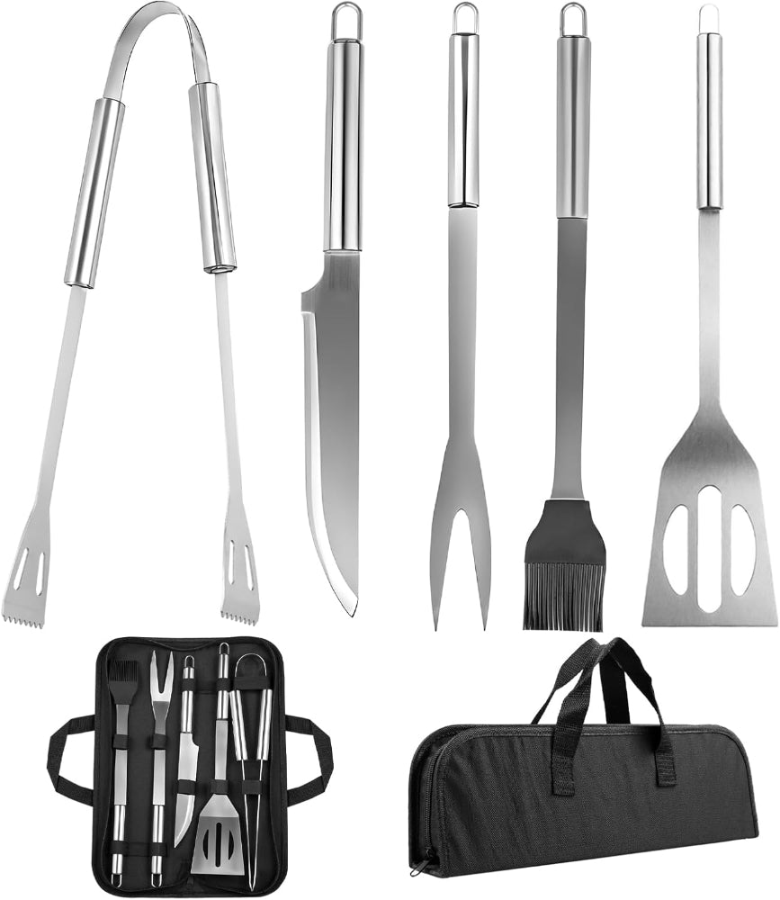 5-Piece Stainless Steel Grill Tool Set – Spatula, Fork, Brush, Knife & Tongs for BBQ, Outdoor Grilling, Practical Gift for Men - Elevate your grilling experience with this Premium BBQ Accessories Set – designed to work with all grill types, including gas, electric, and charcoal. Crafted from high-quality stainless steel with ergonomic, heat-resistant handles, each tool is durable, non-slip, and built to last without rusting, bending, or breaking. The set includes a spatula, grill fork, brush, meat knife, and tongs, each designed for precise flipping, cutting, basting, and handling, while the spatula’s hollow design helps control oil and grease. Convenient loops on each handle make storage easy, and the included Oxford carrying bag ensures portability for backyard, patio, or outdoor adventures. Perfect for men, fathers, or barbecue enthusiasts, this versatile grill set combines quality, functionality, and style, making it an ideal gift for both novices and seasoned grill masters.