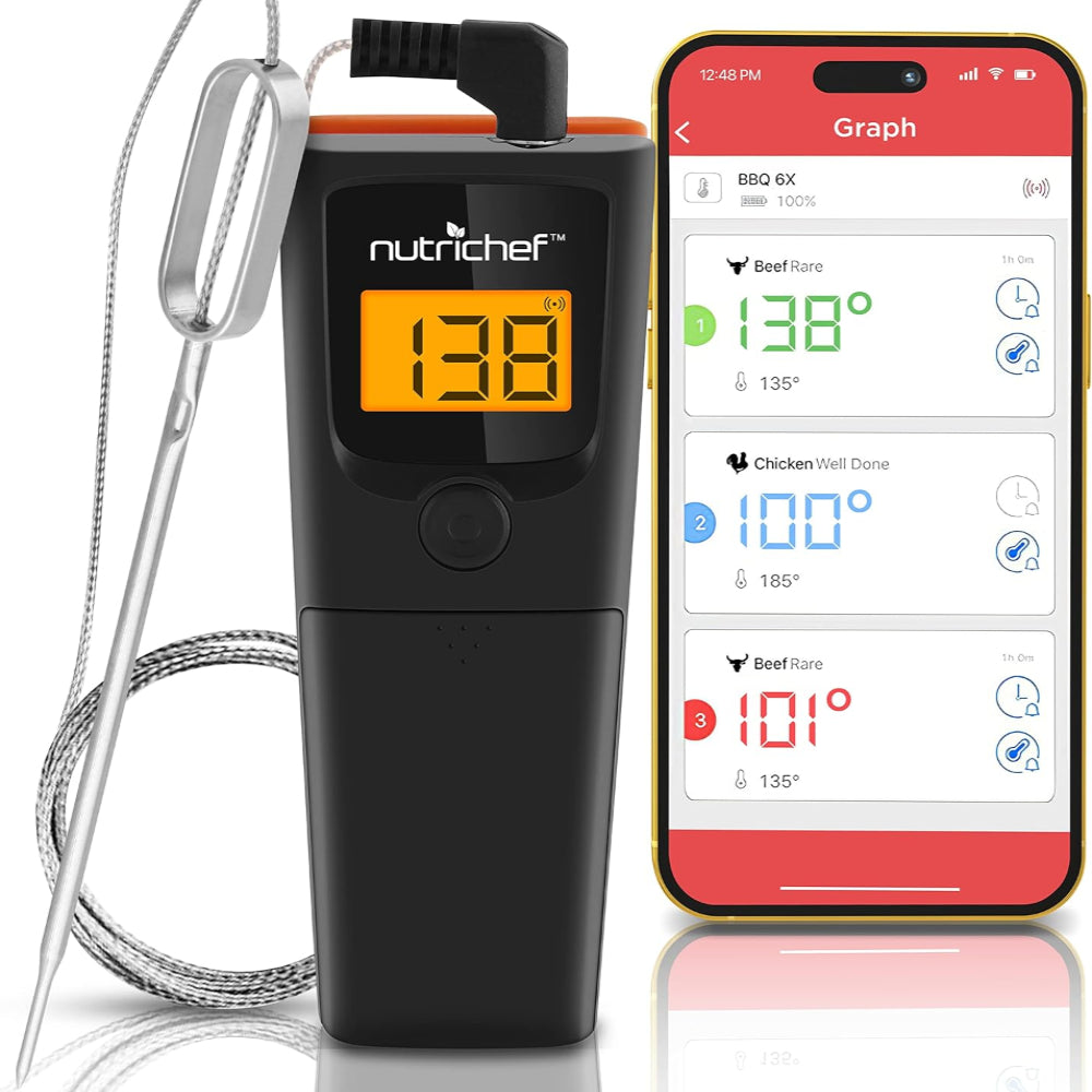 Bluetooth BBQ Meat Thermometer – Wireless Digital Grill & Smoker Thermometer with 150ft Range, Timer & Alarm for Oven Cooking - The NutriChef Smart Barbecue Thermometer is a versatile and convenient tool for grilling, smoking, baking, or deep frying, offering a maximum range of 328 feet (100 feet indoors) and a single stainless steel probe for precise temperature monitoring. Bluetooth-compatible, it works with the EasyBBQ smartphone app to provide real-time temperature readings, view cooking history, and receive alarm notifications with customizable target temperatures. Heat-safe up to 572°F, it supports selectable temperature units from 32–572°F, ensuring accurate results for steaks, breads, cakes, and fried foods. The digital LCD display allows easy reading, while the detachable probe protects components from heat. Battery-operated and cordless, it comes with 2 AAA batteries for portability, making it perfect for both backyard BBQs and gourmet cooking at home.
