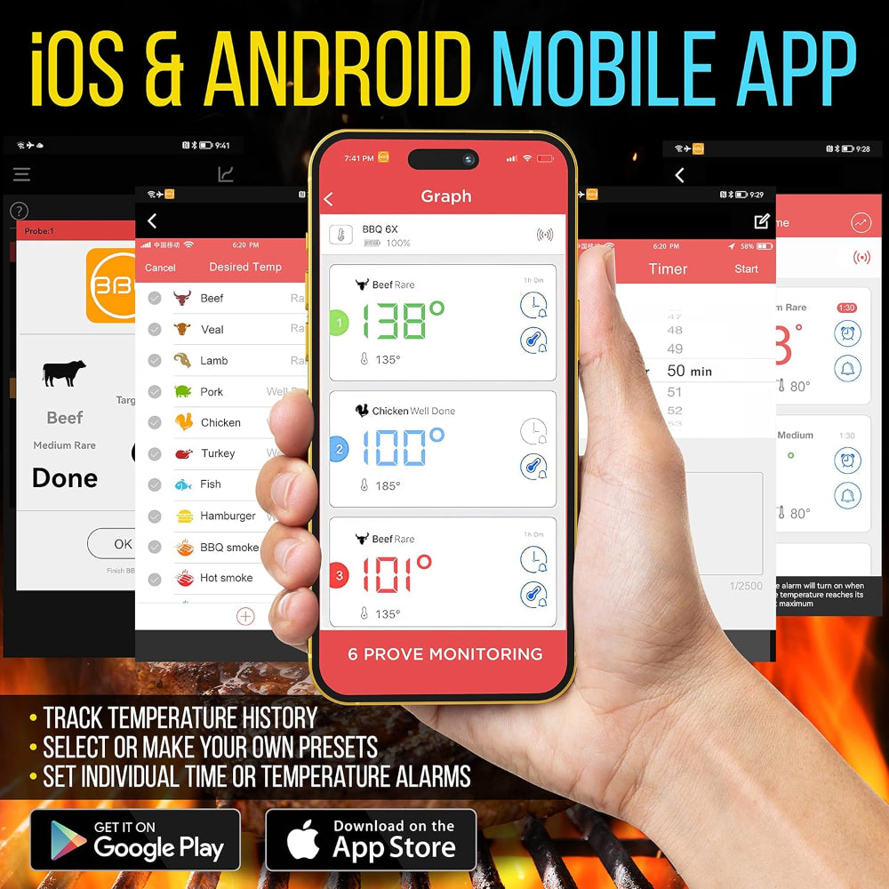 Smartphone App Monitoring: Bluetooth-enabled and compatible with the EasyBBQ app. Monitor real-time temperatures, track cooking history, and set alarm notifications with custom target temperatures directly from your phone.
