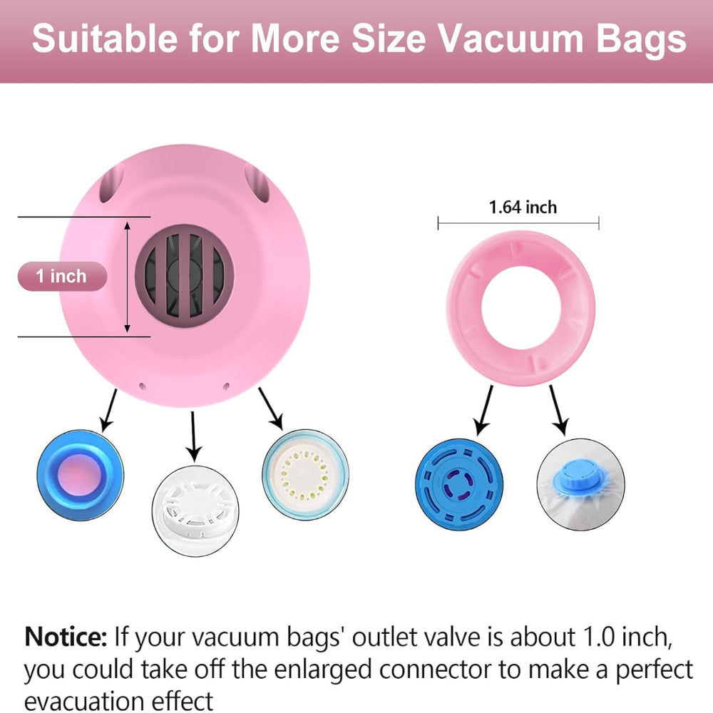 Universal Fit: Includes adjustable connector to fit most vacuum bags. Works with valves ~1 inch (remove enlarged connector) or 1.6 inches (attach enlarged connector) for secure, versatile use.