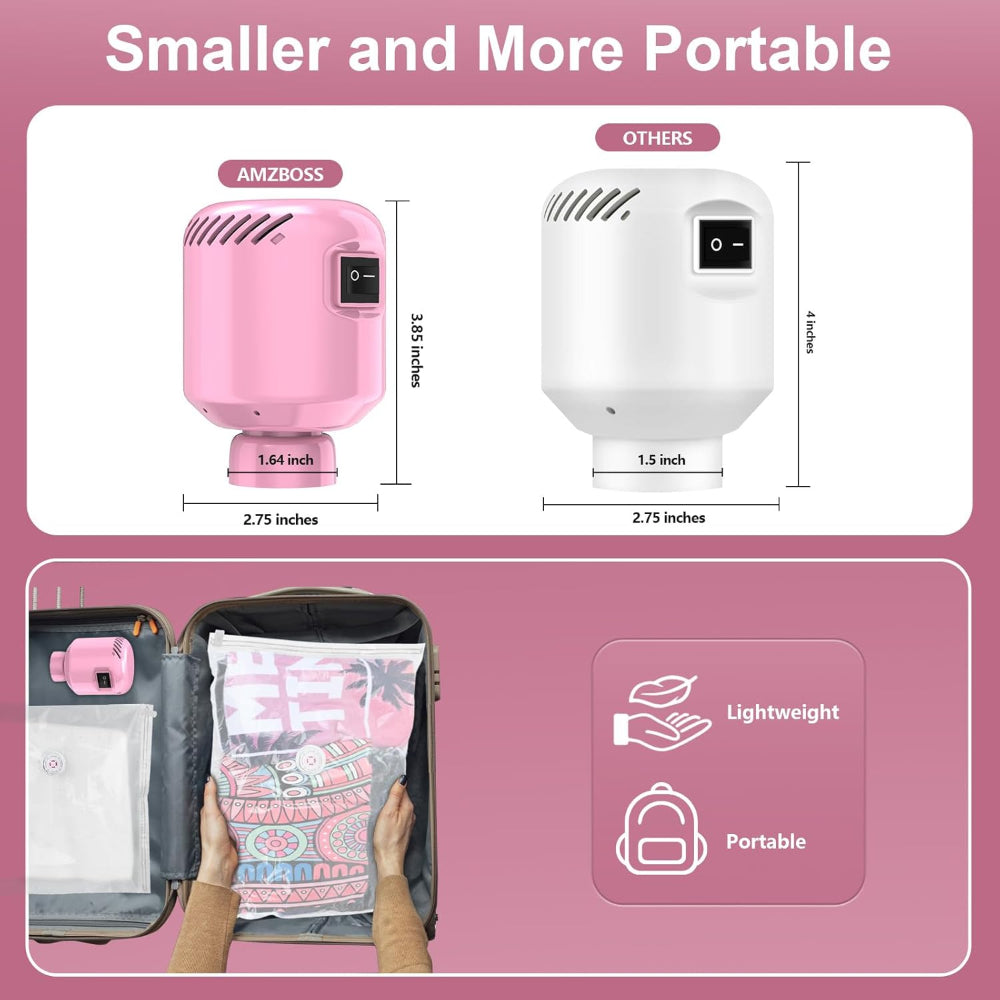 Electric Vacuum Pump – Portable Pump for Storage Bags, Clothing, Blankets & Bedding, Works with Various Vacuum Seal Bags, Pink (Bags Not Included) - This Electric Vacuum Pump is a powerful and compact solution for effortless storage and space-saving. Designed to compress vacuum bags three times faster than manual pumps, it creates airtight seals in just 15–30 seconds, making it perfect for clothes, bedding, and travel packing. Its industrial-grade motor delivers a strong vacuum effect, efficiently removing air from even large storage bags and maximizing closet, suitcase, or under-bed space. The pump comes with an adjustable connector, ensuring compatibility with most vacuum bags—simply use the standard or enlarged connector depending on the valve size. Compact and lightweight at just 2.75 x 2.75 x 3.85 inches and 0.5 lbs, it easily fits in purses, carry-ons, or drawers without sacrificing performance. Ideal for home storage, seasonal wardrobe changes, moving, or travel, this versatile electric pump can vacuum-seal clothes, blankets, comforters, mattresses, and more, making organization faster, easier, and more efficient.