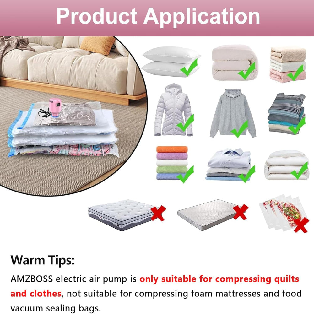 Versatile Applications: Perfect for home storage, closet optimization, moving, or travel. Can vacuum-seal clothes, blankets, comforters, bedding, mattresses, and laundry efficiently.