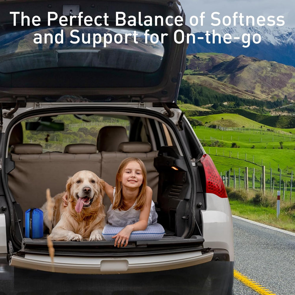 Memory Foam Travel Pillow – Contoured Medium-Firm Support for Sleeping – Lightweight & Compact Use for Airplanes, Camping, Car & Backpacking – Breathable, Washable Cover – Toddler & Kids Friendly - Sleep comfortably wherever you go with this premium travel pillow, crafted from gel-infused ventilated memory foam that contours to your neck, shoulders, and spine for superior support and pressure relief. Certified by CertiPUR-US, it is hypoallergenic, odor-free, and resistant to deformation, offering durable, home-quality comfort on the road. The dual-sided washable cover features cooling ice silk for hot sleepers and soft bamboo rayon for warmth and moisture-wicking, keeping you cozy in any environment. Compact and lightweight, it compresses into the included waterproof travel bag and can attach securely to luggage or backpacks, ideal for camping, backpacking, airplanes, cars, and hotels. With an elastic strap for securing to seats or sleeping bags, it also doubles as lumbar or knee support, making it versatile for adults and toddlers alike. Ergonomically designed with medium firmness, this pillow is perfect for back, side, and stomach sleepers, and makes a thoughtful gift for travelers.