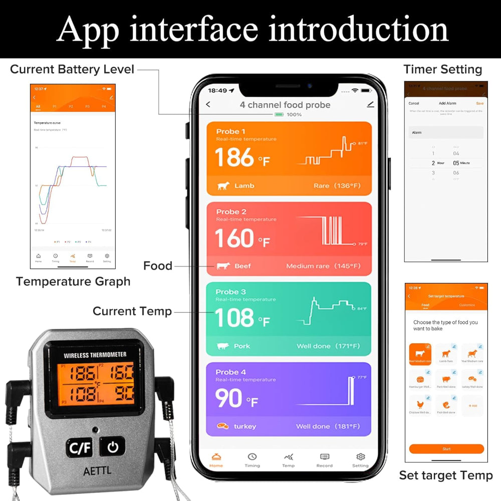Bluetooth Connectivity – Monitor food remotely with a stable app connection up to 100ft indoors and 165ft outdoors.