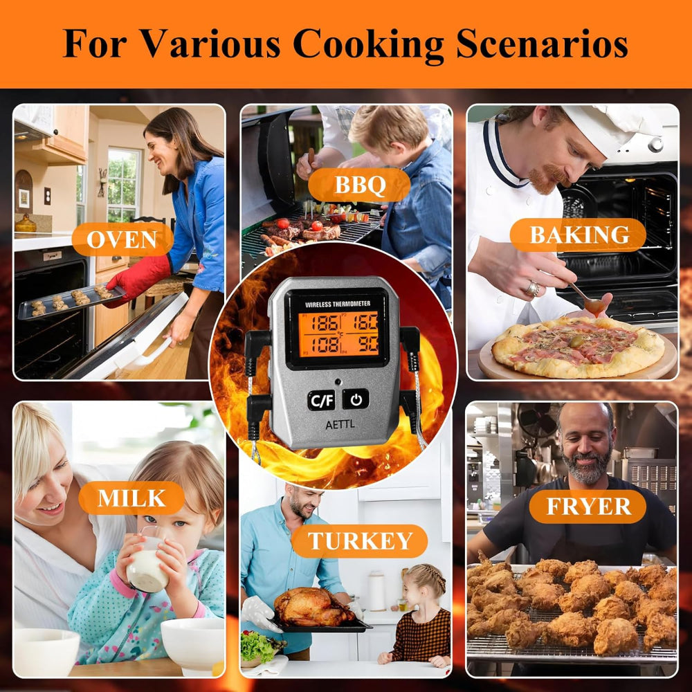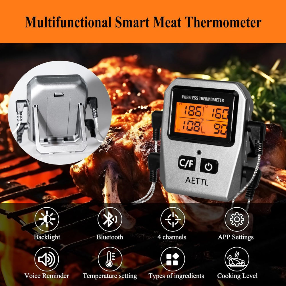 Wireless Digital Meat Thermometer – Instant Read with LCD Display & 4 Stainless Steel Probes, Waterproof Food Thermometer for BBQ, Grill & Kitchen Cooking - Cook with confidence using this Bluetooth Digital Meat Thermometer, designed to bring smart convenience to your kitchen or grill. With a strong Bluetooth connection offering up to 100ft indoor and 165ft outdoor range, you can remotely monitor your food’s temperature through a stable, user-friendly app. Set your desired temperature and countdown timer, and receive alerts with sound and flashing backlight when your food reaches the perfect doneness. The large backlit LCD display clearly shows readings, allowing you to monitor grill, oven, or smoker temperatures across a wide range from -58°F to 572°F. Equipped with four color-coded 6.1-inch stainless steel probes, you can track multiple meats at once for efficient cooking. The multifunctional mobile app provides real-time notifications, customizable alarms, temperature graphs, and preset USDA-recommended settings to help you achieve perfectly cooked meals every time.