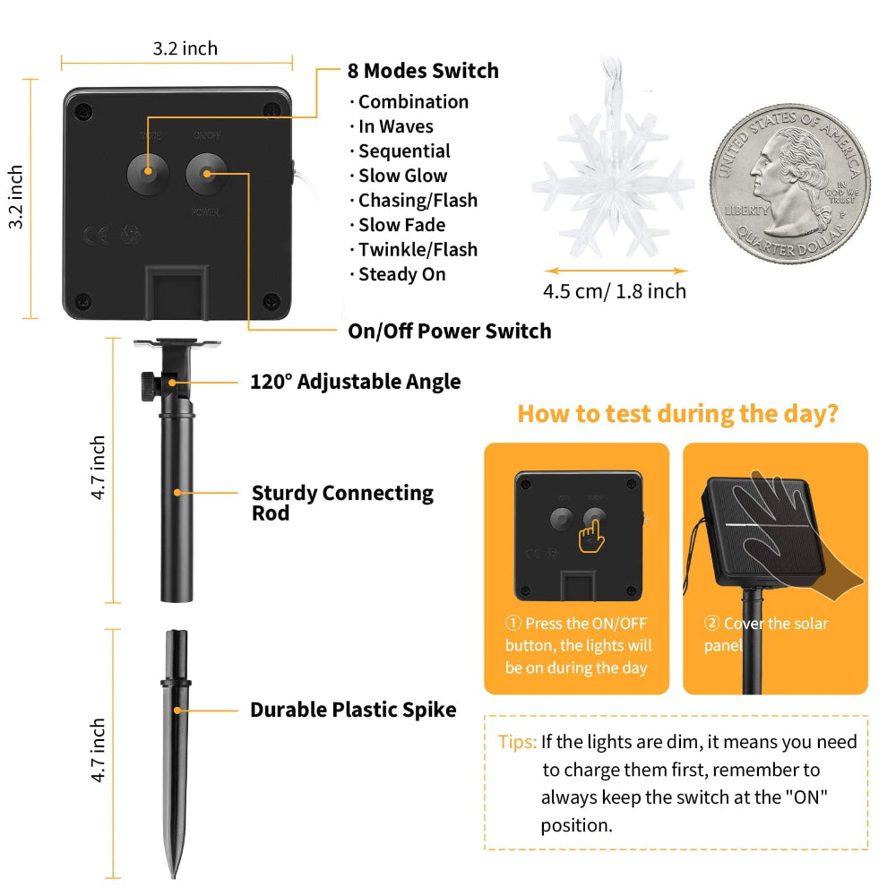2-Pack Solar Snowflake String Lights – 100 LED 39FT Outdoor Waterproof Fairy Lights with 8 Lighting Modes- Create a Magical Holiday Glow – This 39 ft solar-powered snowflake string features 100 warm white LED lights for a romantic falling snowflake effect. With a 180° adjustable solar panel and 600mAh rechargeable battery, enjoy 8–10 hours of eco-friendly illumination after 6–8 hours of charging. Built with durable, IP65 waterproof materials, these lights withstand rain, sun, or snow, perfect for indoor or outdoor décor. Choose from 8 lighting modes and enjoy automatic on/off at dusk and dawn, with secure snowflake attachments for long-lasting use.