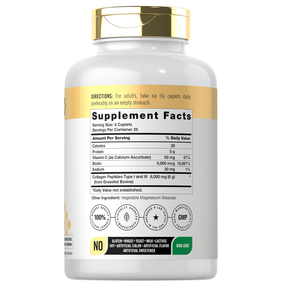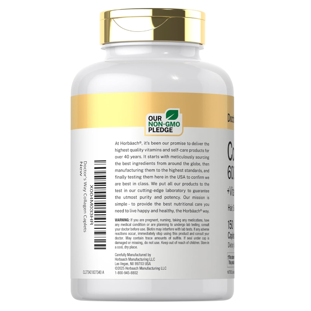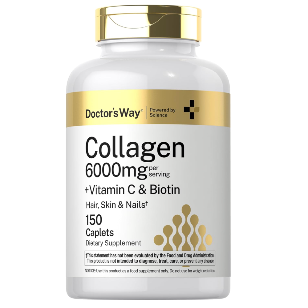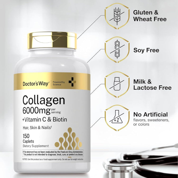 150-Caplet Collagen Complex Supplement – with Vitamin C & Biotin, Non-GMO, Gluten-Free for Healthy Skin, Hair & Nails - Support healthy skin, hair, nails, and joints with Doctor’s Way Collagen Complex, a premium supplement designed for daily wellness. Each bottle contains 150 caplets enriched with collagen peptides, vitamin C, and biotin to promote natural collagen production and overall vitality. Made from non-GMO, gluten-free ingredients, this formula ensures safe and effective supplementation for a wide range of dietary needs. Easy-to-take caplets make it simple to maintain your beauty and wellness routine every day. Perfect for adults looking to support skin elasticity, stronger nails, healthier hair, and joint health, this collagen complex is a convenient addition to any self-care regimen.