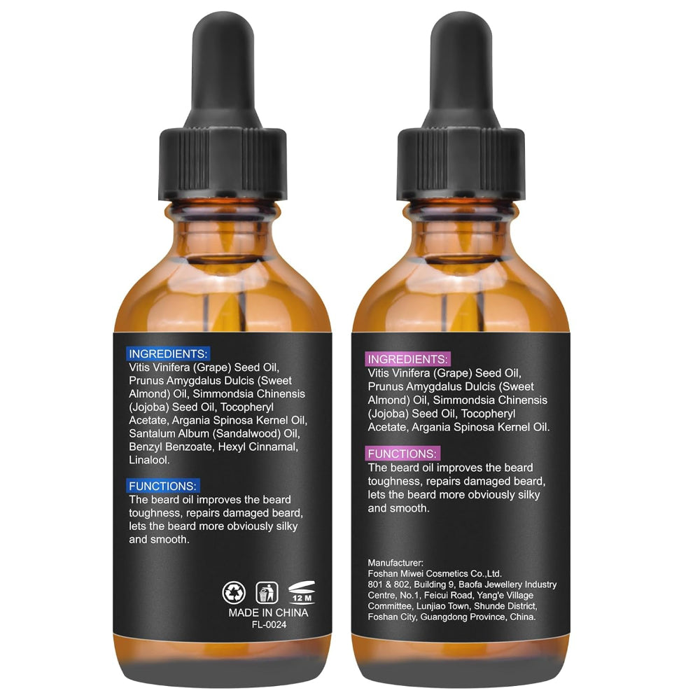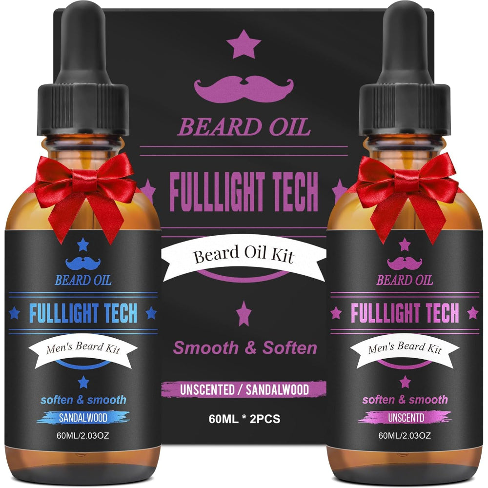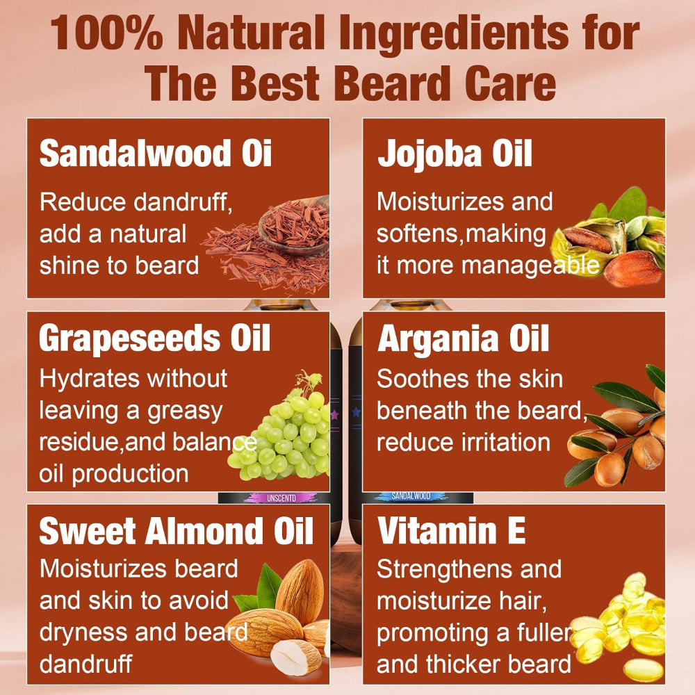 2-Pack Beard Oil 4oz – Natural Beard Growth Oil with Sandalwood & Unscented Formula for Softening, Strengthening & Moisturizing - Grow a softer, fuller-looking beard with this nourishing beard oil designed to strengthen facial hair and promote healthy growth. The lightweight, non-greasy formula deeply moisturizes to reduce dryness, split ends, tangles, beardruff, and irritation while leaving your beard smooth and manageable. Crafted with a premium blend of natural oils and vitamin E, it absorbs quickly to hydrate both beard and skin without residue. Available in a refined sandalwood option or a clean unscented version, it’s the perfect addition to any beard care routine for a polished, healthy finish.