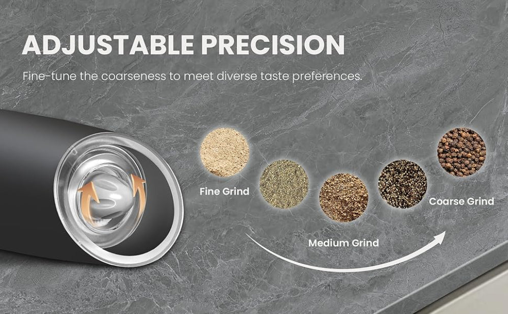 2-Pack Electric Salt & Pepper Grinders – Battery-Operated Gravity Mills with LED Light & Adjustable Coarseness - Upgrade your kitchen with this 2-pack of Electric Salt and Pepper Grinders, designed with hands-free gravity operation for effortless seasoning. Each grinder features adjustable coarseness settings, a bright LED light for precision, and a clear chamber for easy refills. Powered by 6 AAA batteries per grinder, these automatic mills deliver smooth, consistent grinding for salt, pepper, or spices. A stylish and convenient addition to any kitchen or dining setup.