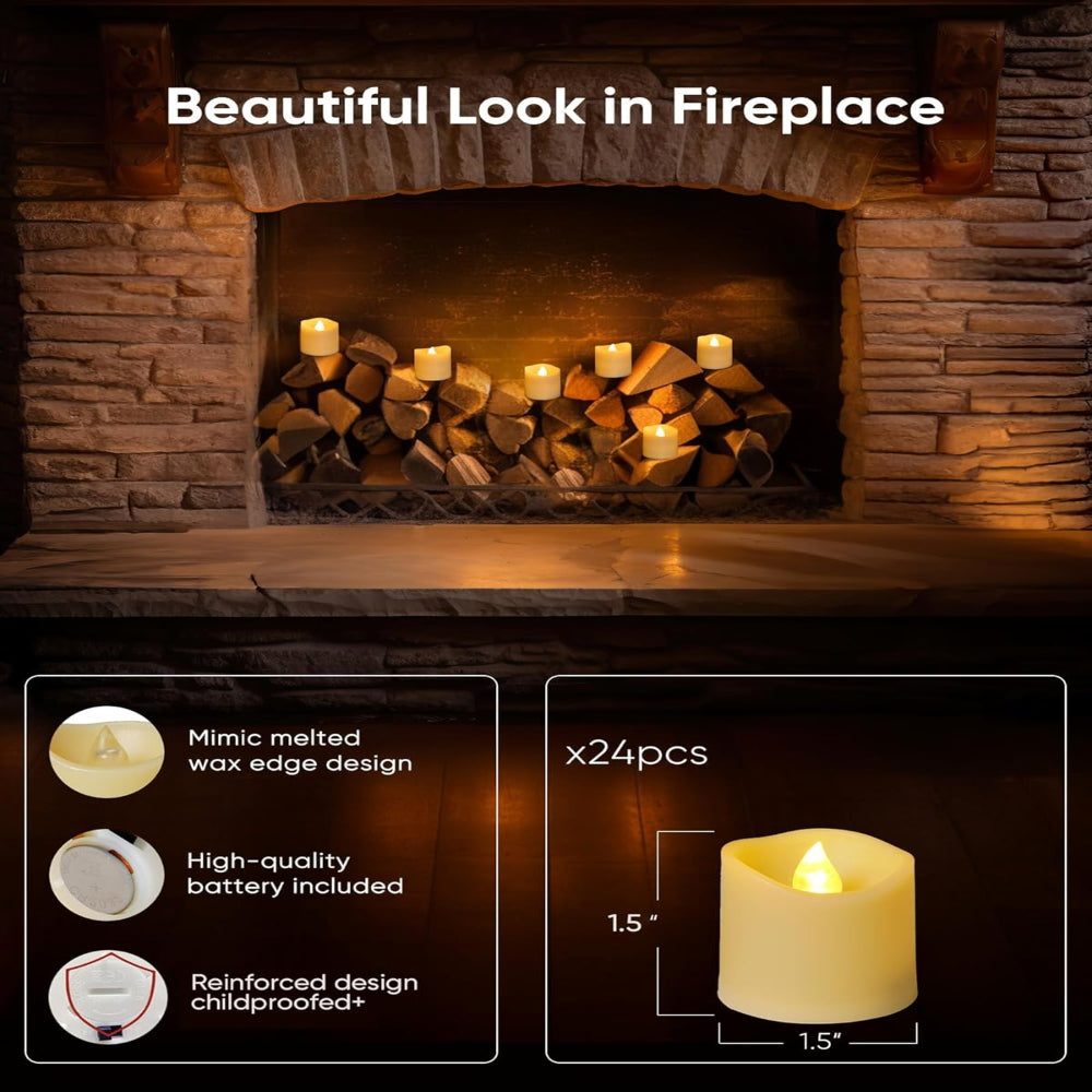 24-Pack Flameless Votive Candles – Long Lasting Battery Operated Tealights with Warm White Glow for Home Decor - Experience the warm, inviting glow of these 200+ Hour Battery Long-Lasting LED Votive Candles, designed to bring a touch of elegance and safety to any space. Crafted from high-quality ivory polypropylene, each candle measures 1.5" x 1.5", perfectly fitting most votive holders for versatile use in weddings, home décor, outdoor events, festivals, Halloween, and Christmas decorations. The soft white LED light mimics a natural flickering flame, creating a romantic and cozy atmosphere without the risk of open fire. Pre-installed CR2032 batteries provide over 200 hours of continuous use, and replacement is quick and easy, ensuring long-lasting enjoyment. CE certified for safety, these flameless candles combine durability, realism, and convenience for a stylish, worry-free lighting solution.