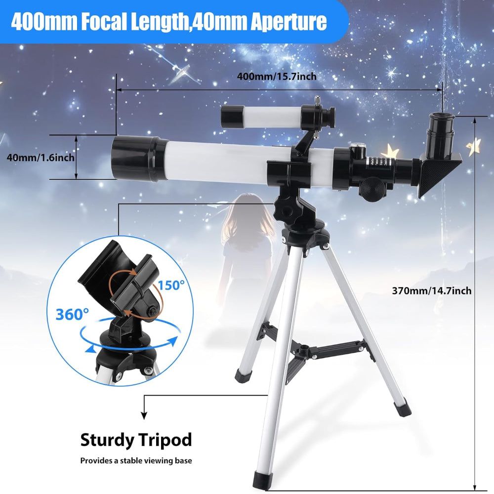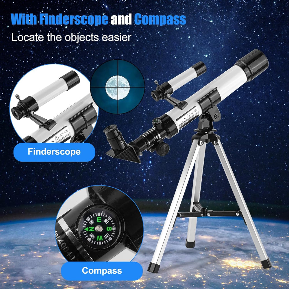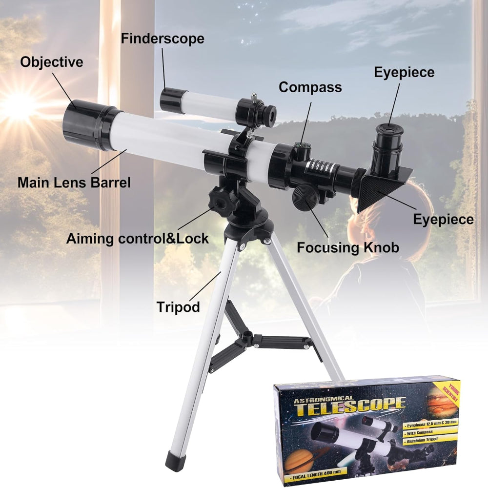 Telescope 40/400mm Refractor – Tripod Mounted with Finder Scope Compass - Explore the wonders of the universe with this Kids’ Astronomical Refractor Telescope – designed for beginners and young stargazers alike. Featuring a 40mm aperture and 400mm focal length with multi-layer broadband coatings, it delivers clear, sharp images of the night sky and distant landscapes. The telescope comes with two eyepieces (H20mm and H12.5mm) for 20x and 32x magnification, a 5x18 finder scope, and a built-in compass to quickly locate celestial objects. Effortless tool-free setup allows 160° vertical and 360° horizontal adjustment, making it easy for kids and beginners to explore. A lightweight aluminum tripod ensures stable viewing anywhere, whether at home or outdoors. Perfect as an educational gift, this telescope inspires curiosity and a love for astronomy, making learning about space fun and interactive.