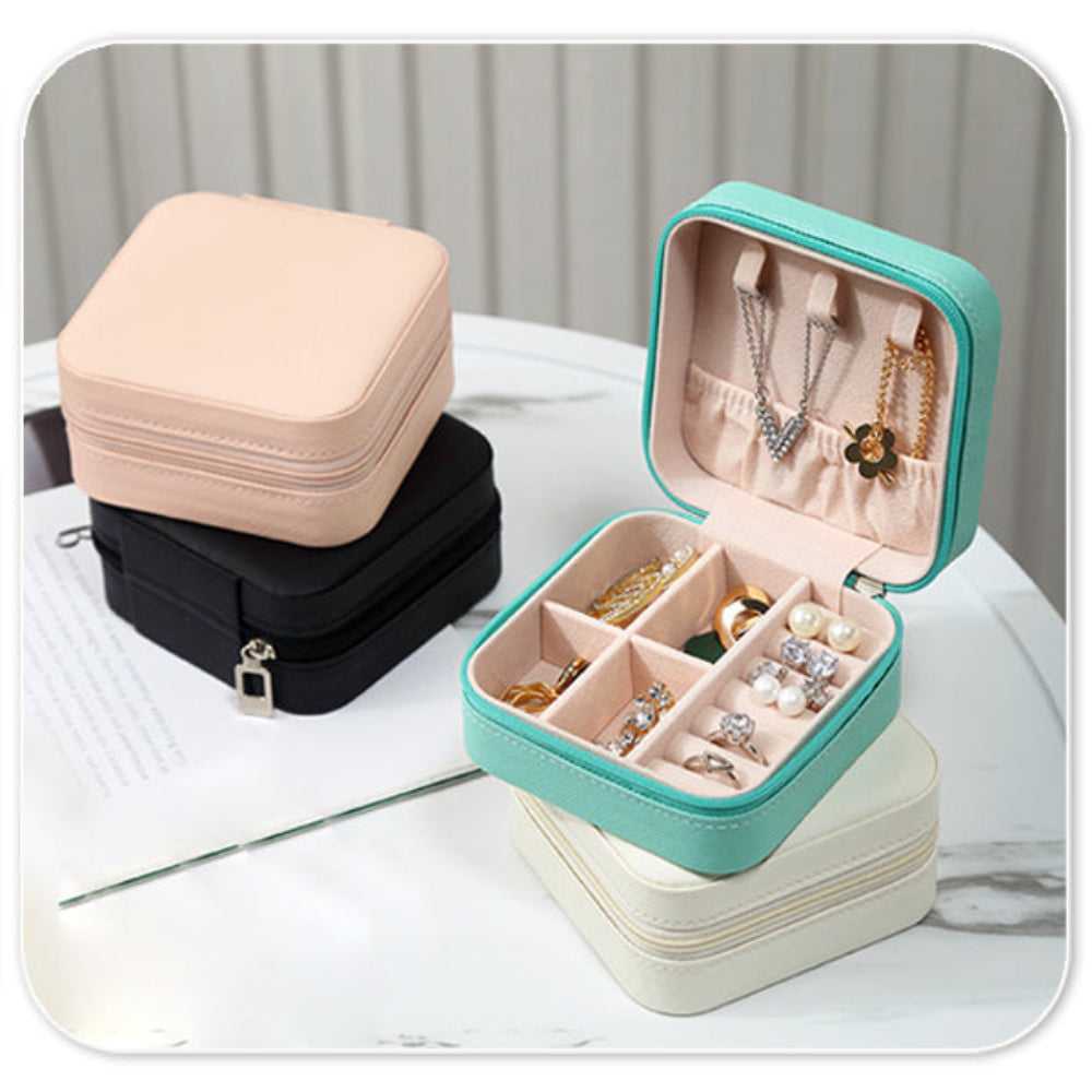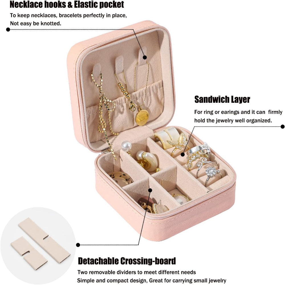 Mini Jewelry Travel Case – Portable Jewelry Organizer for Rings, Earrings, Necklaces & Bracelets - Store and protect your accessories in style with this Mini Jewelry Travel Case, crafted from smooth, durable PU synthetic leather with a soft flannel-lined interior to prevent scratches, fading, and damage. Measuring 3.9 x 3.9 x 2 inches, this lightweight and compact organizer easily fits into handbags or luggage for effortless travel and everyday use. A secure zipper closure keeps items safely stored, while two removable dividers allow flexible organization based on your needs. Designed to hold rings, earrings, necklaces, bracelets, watches, lipsticks, and other small accessories, it keeps everything neatly separated and easy to access. With its simple, minimalist design and sturdy construction, this jewelry storage box makes a practical and elegant gift for birthdays, holidays, weddings, or special occasions.