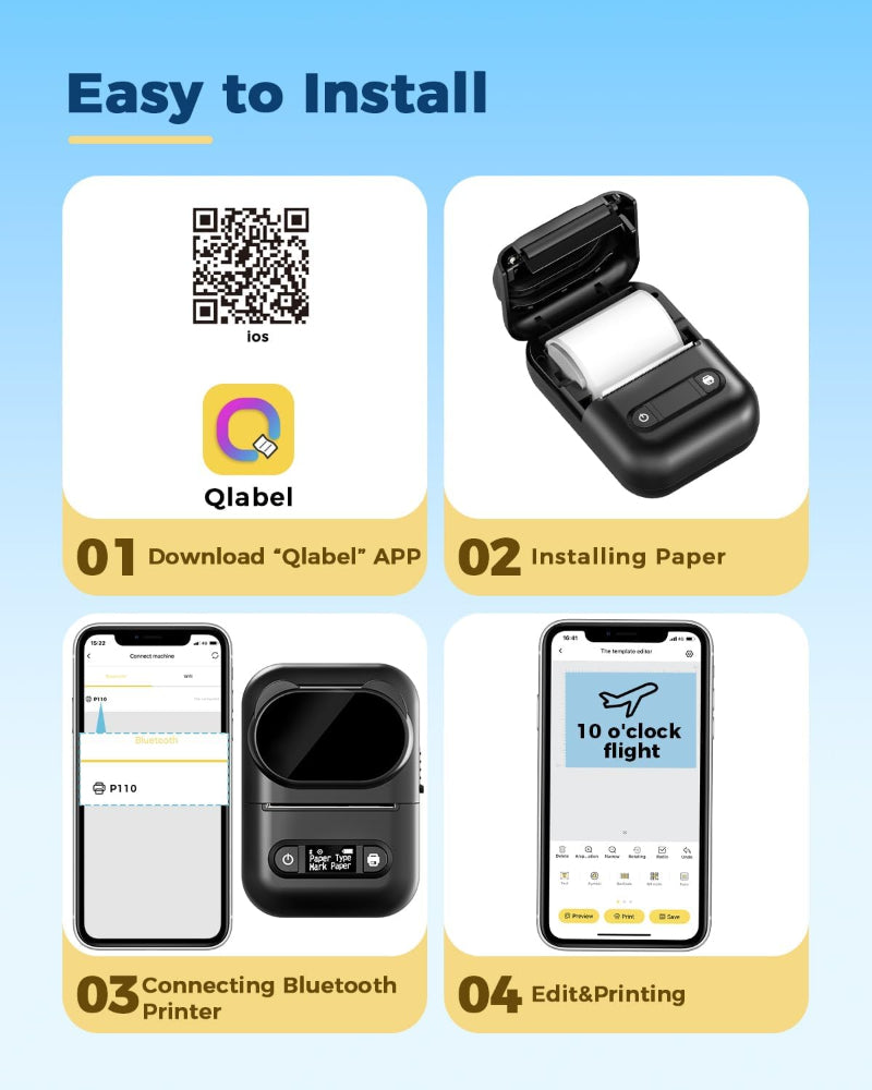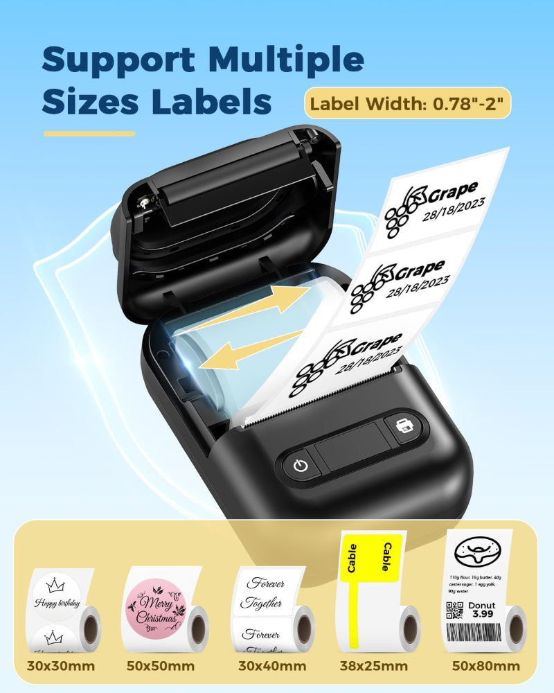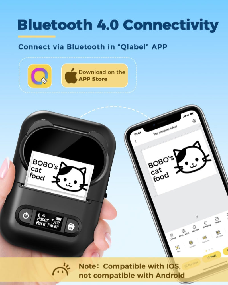 Portable Bluetooth Label Maker – Thermal Printer for Home, Office, Organization, Android & iOS Compatible, Includes 1 Roll Tape - Create professional labels anytime with this mini portable Bluetooth thermal label maker – easily connect to iOS and Android devices using the free “Qlabel” app. Simply install the paper roll, pair via Bluetooth, choose from quick templates, and start one-click printing. This wireless label printer features customizable templates, supporting QR codes, barcodes, tables, text, icons, pictures, and more, with 20+ fonts, 300+ emojis, and 200+ materials for personalized designs. Save time and money with ink-free thermal printing, perfect for small businesses, home organization, retail, crafts, jewelry, and address labels. Compact, lightweight, and portable, this mini label maker fits anywhere and makes printing fast, convenient, and efficient. Ideal for everyday labeling needs, holidays, or special events, helping you stay organized and productive.
