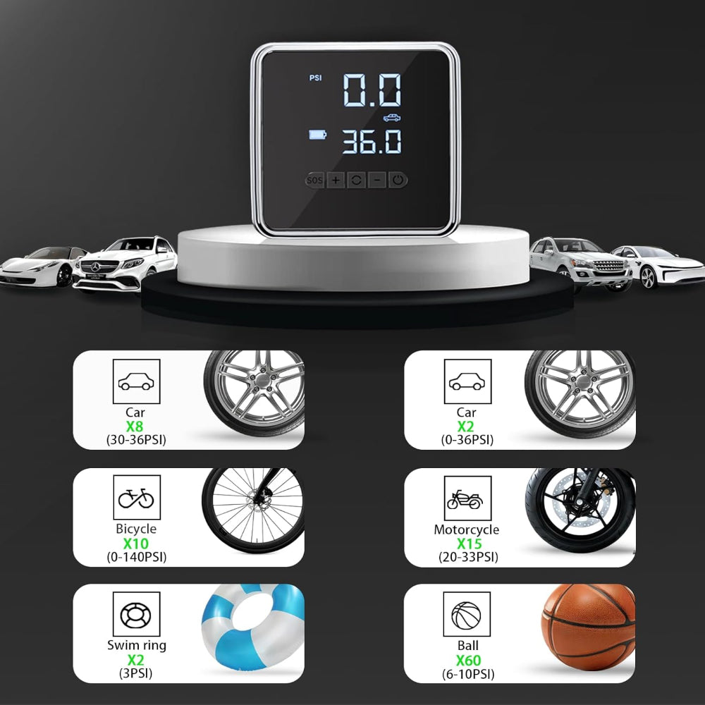Portable Tire Inflator – 150 PSI Air Compressor Pump – Fast Inflation for Cars, Motorcycles, Bicycles & Sports Balls - Keep your tires properly inflated anywhere with this Portable Car Tire Inflator, designed for fast, efficient, and convenient inflation. With a maximum pressure of 150 PSI, it can inflate car, motorcycle, bicycle, truck, and RV tires quickly—pumping a standard car tire from 29 to 36 PSI in under a minute. The smart compressor features automatic tire pressure detection, a memory function to save your preset pressure, and auto-shutoff to prevent over-inflation, with four selectable units (PSI, Bar, kPa, kg/cm²) for accuracy. Built-in LED lighting makes nighttime use safe and easy, while the 4500mAh rechargeable battery and USB power bank function ensure long-lasting operation and emergency device charging. Compact, lightweight, and portable at under 2 lbs, it includes multiple adapters, a Schrader hose, TYPE-C cable, and storage bag—perfect for road trips, outdoor adventures, and car emergencies.