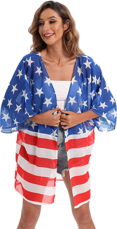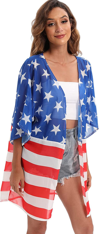 Women's American Flag Kimono 4th of July Patriotic Beach Cover up Lightweight Chiffon Cardigan Shirt Blouse