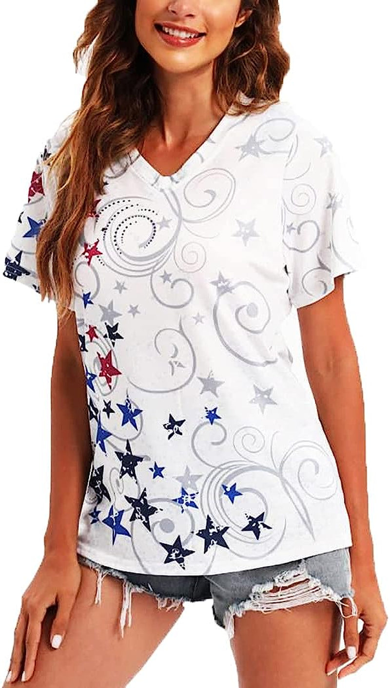 Popular Oils Printing of Patriotic American Flag for Womens V Neck Tee Shirts Stars and Stripes Shirts for Women Fourth of July Outfit