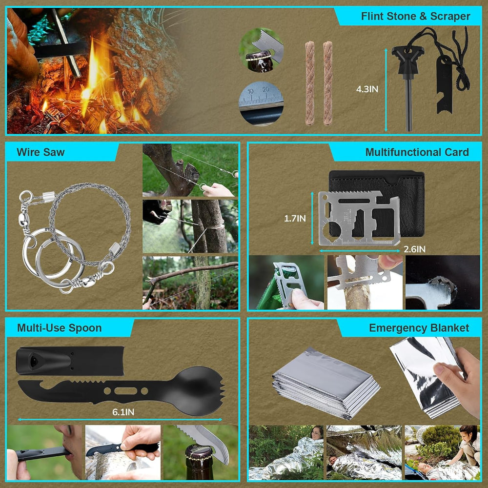 Professional Survival Gear Included – Equipped with survival tools such as a multi-function axe/hammer, shovel/pick, fire starter, SOS flashlight, emergency tent, thermal blanket, compass, paracord bracelet, and wire saw.