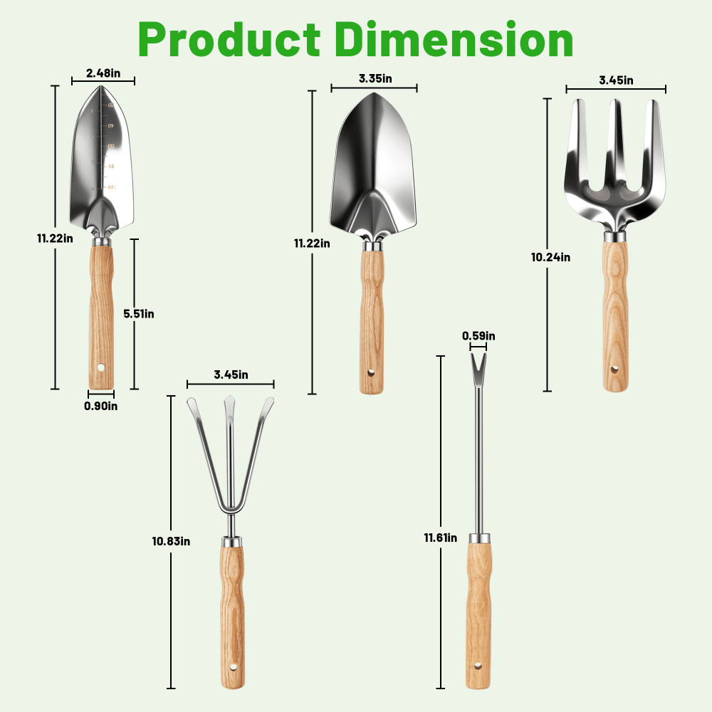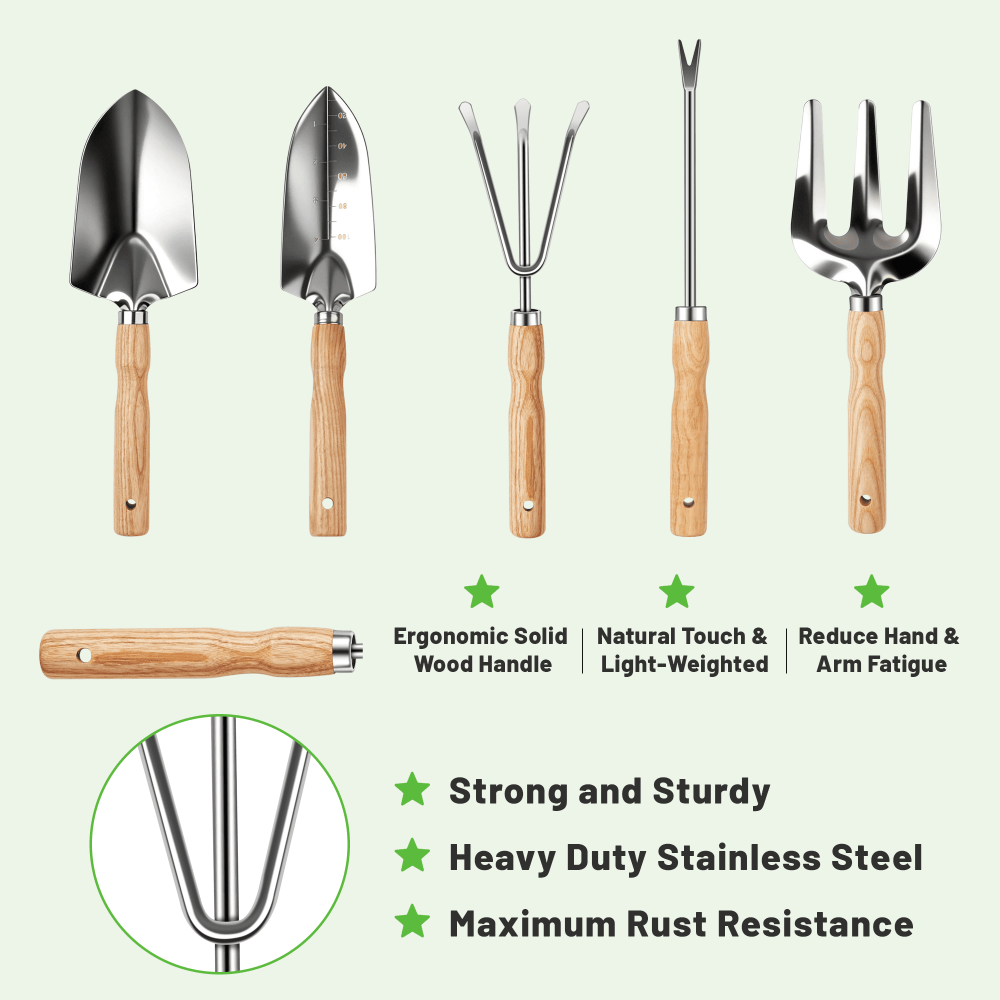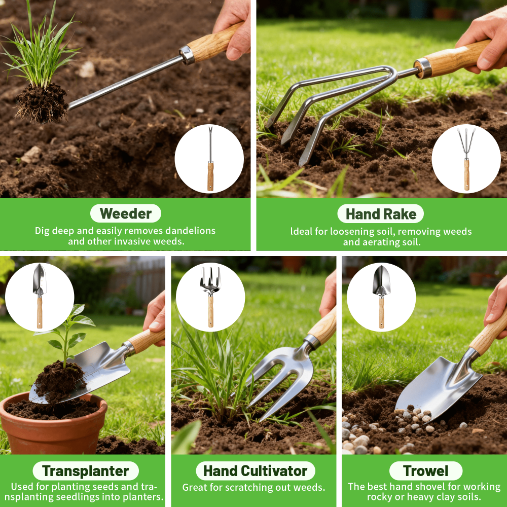 - Complete Tool Set – Includes trowel, transplanter, cultivator, weeder, and hand rake.
