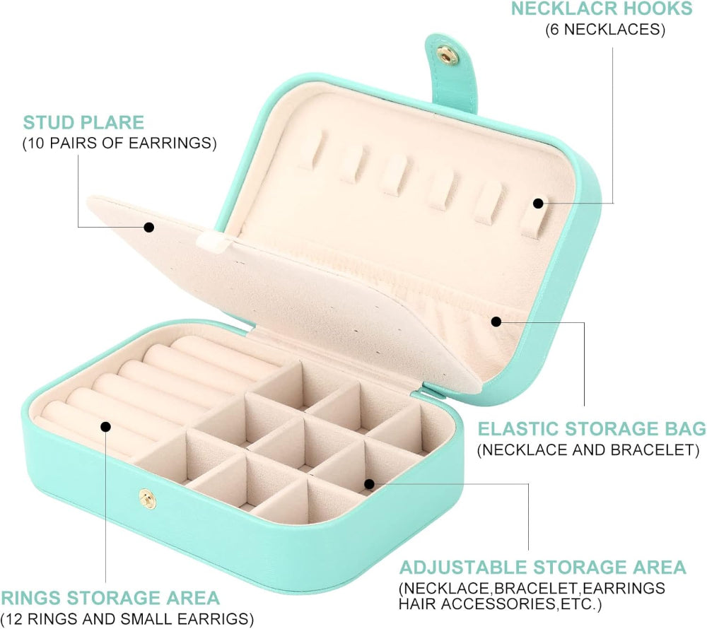 Mini Travel Jewelry Box – Compact Jewelry Organizer Case with Secure Storage - This mini travel jewelry box keeps rings, earrings, necklaces, and small accessories neatly organized while on the go. Designed with a compact structure, it fits easily into handbags, carry-ons, or luggage without taking up extra space. The structured interior helps prevent tangling and damage, making it ideal for travel, daily use, or craft storage. A secure closure keeps items protected, while the fresh green color adds a stylish touch. Perfect for vacations, weekend trips, or gifting, this jewelry organizer offers practical storage in a portable design.