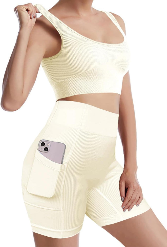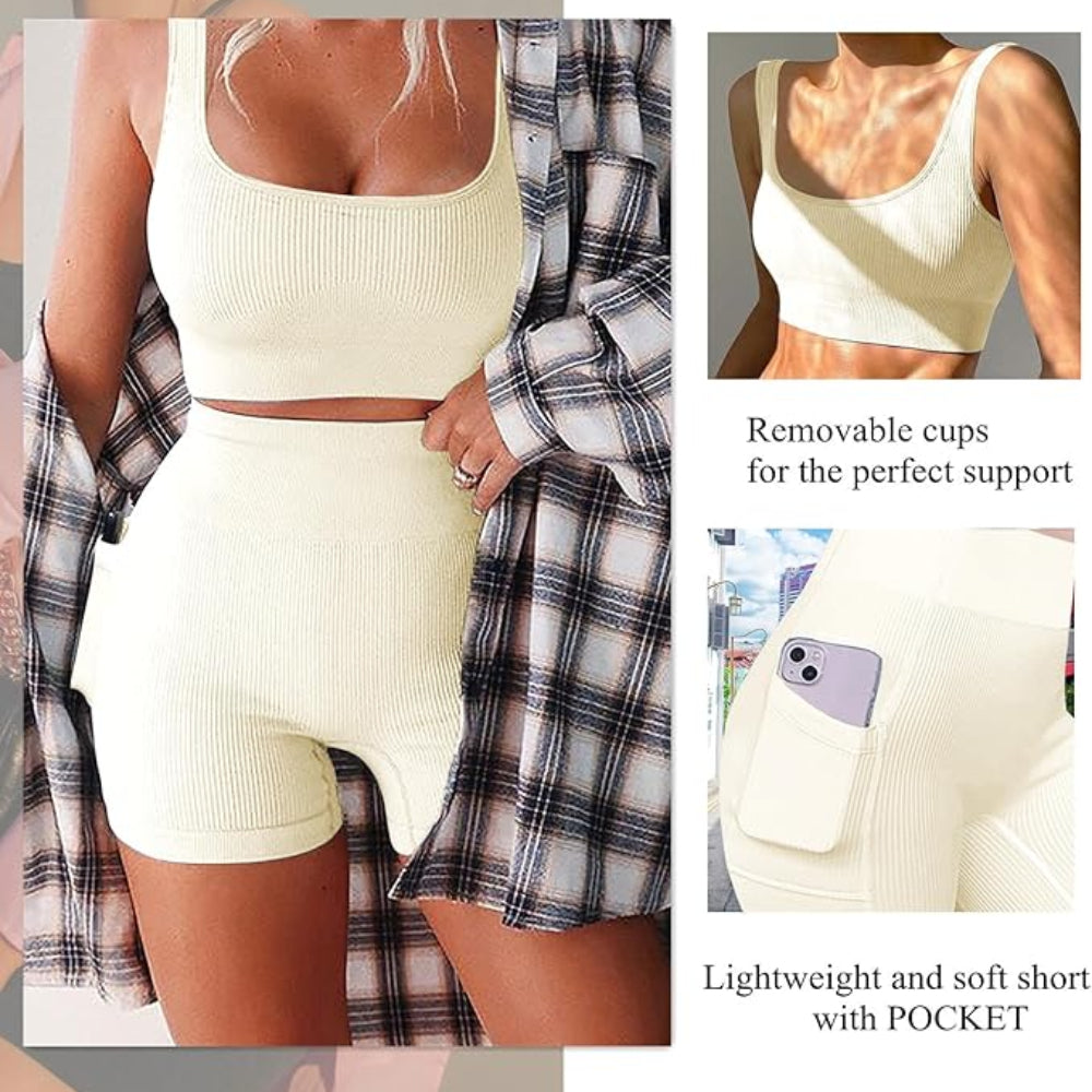 2-Piece Seamless Workout Set – Crop Top & Leggings, Yoga & Gym Training, Stretch Fabric - Upgrade your activewear with this Ribbed Seamless Workout Set for Women – Designed for Comfort, Support, and Performance. Made from a premium blend of 90% nylon and 10% elastane, the thick, ultra-stretchy fabric is breathable, moisture-wicking, quick-drying, and completely non-see-through for confident movement. The set includes a supportive sports bra with removable padding and wide shoulder straps for high-impact workouts, plus high-waisted shorts that provide gentle tummy compression and a stay-put fit. A sleek linear neckline highlights the collarbone while reinforced stitching enhances durability and wear resistance. This versatile 2-piece set is perfect for yoga, gym training, running, Pilates, outdoor workouts, or everyday active wear.