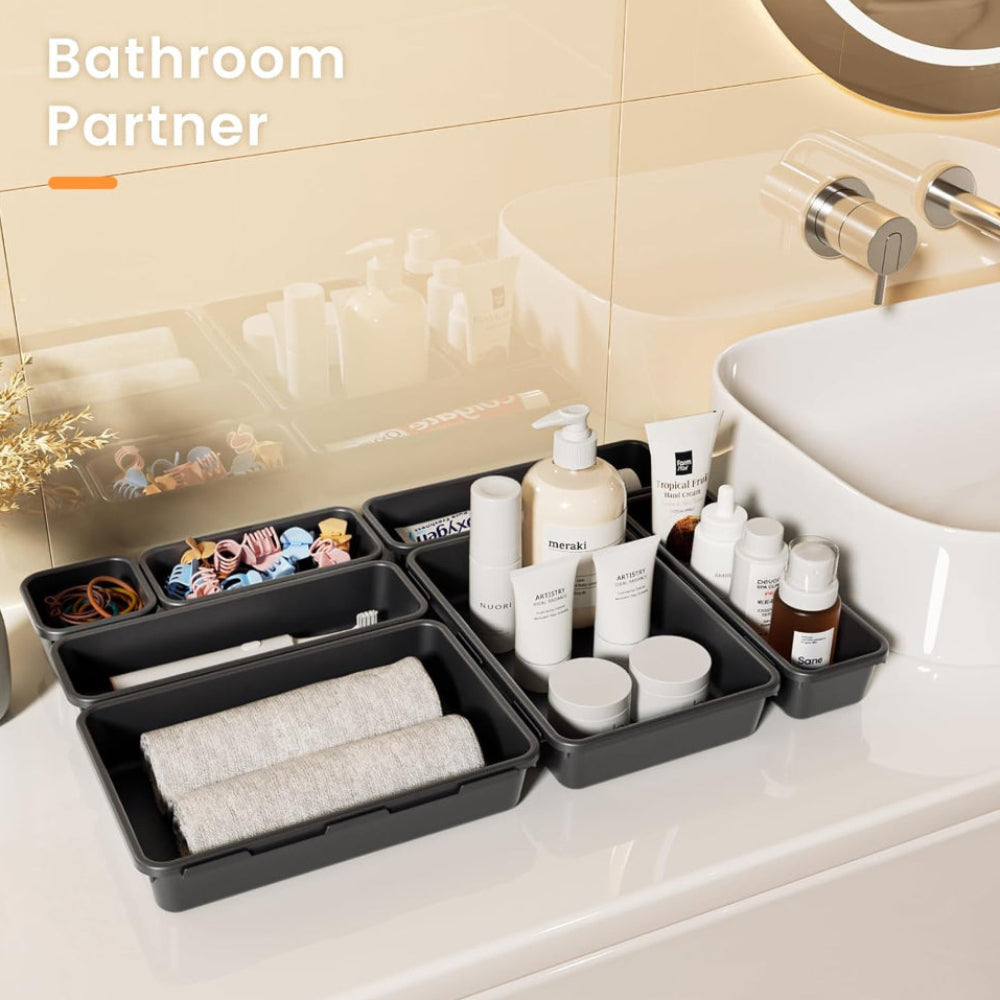 28 Piece Drawer Organizer Set for Office or Bathroom – Desk and Vanity Storage Solution for Organization- Keep your space neat and clutter-free with this Durable Drawer Organizer Set – designed for makeup, bathroom essentials, and office supplies. Featuring five adjustable compartments, it can hold up to 177 items, including cosmetics, skincare products, brushes, or small accessories, keeping everything visible and easily accessible. Crafted from durable, high-quality materials, this organizer withstands daily use while maintaining a sleek, professional appearance. Its versatile design fits most drawers, desks, and vanity tops, making it perfect for home or office organization. Maximize storage, simplify your routine, and enjoy a tidy, organized space with this heavy-duty, multifunctional drawer organizer.