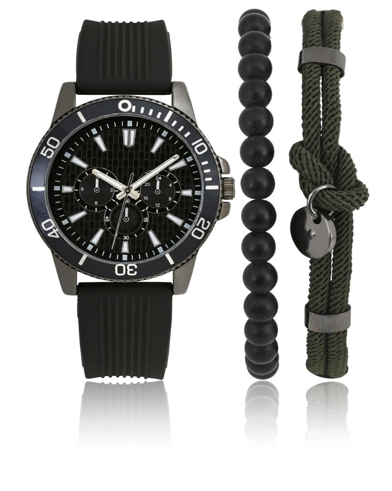 One (1) 3-Piece Men’s Watch and Bracelet Set – 46mm Black Rubber Chronograph with Beaded and Cord Bracelets