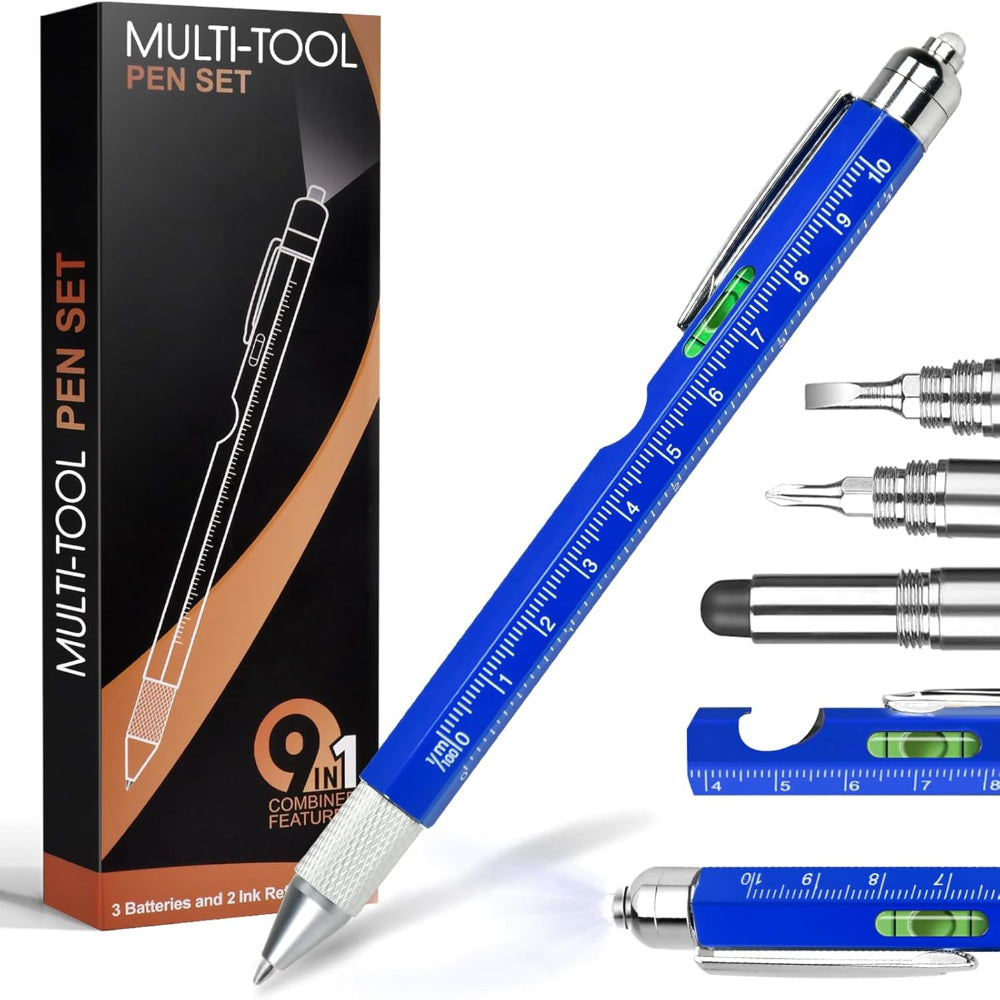 9-in-1 Multitool Pen – Multifunction Pocket Tool Use – Writing & Everyday Utility Tool – Includes Screwdriver, Stylus & Compact EDC Gadget - This 9-in-1 multitool pen is a compact and practical gadget designed for everyday use and makes a great gift for dads, husbands, or anyone who enjoys useful tools. It combines multiple functions including a ballpoint pen, stylus, flathead and Phillips screwdrivers, bottle opener, phone holder, bubble level, ruler, and LED light, all in a pocket-sized design. Made from durable aluminum, it is built for convenience and portability, helping with small tasks like tightening screws, measuring, writing, or providing light in dark spaces. The twist mechanism allows easy access to each tool, and it includes extra ink refills and batteries for long-term use.