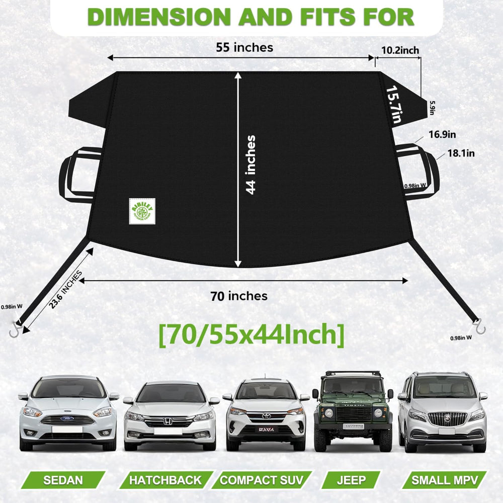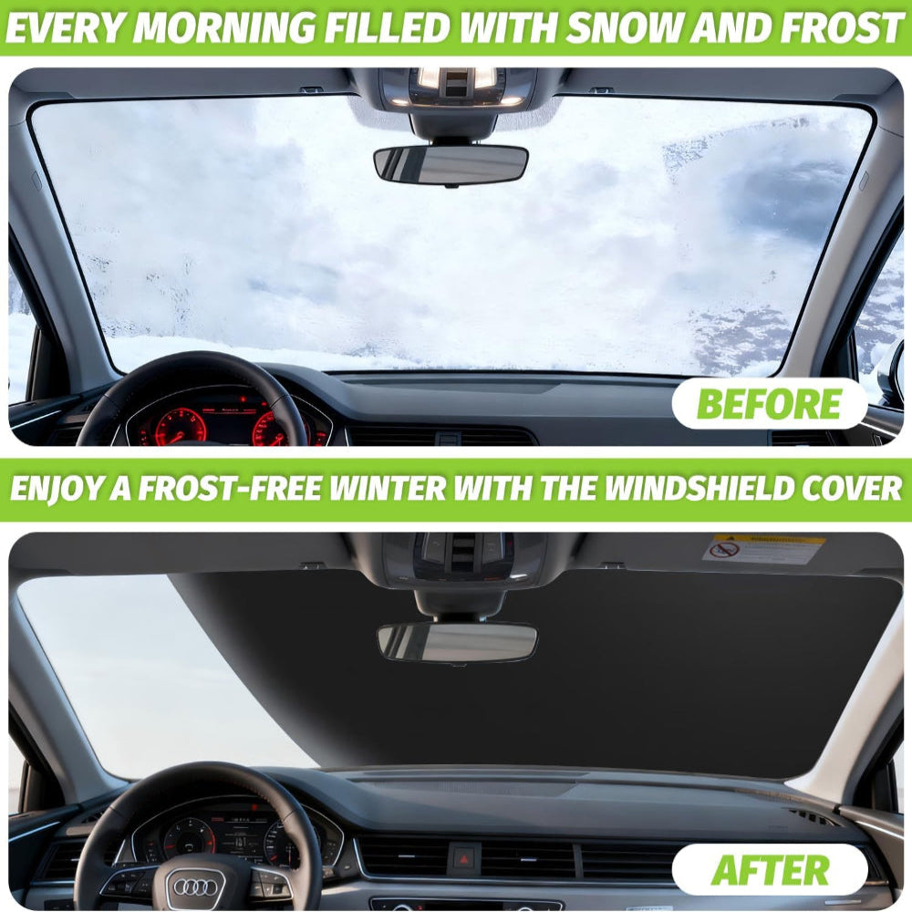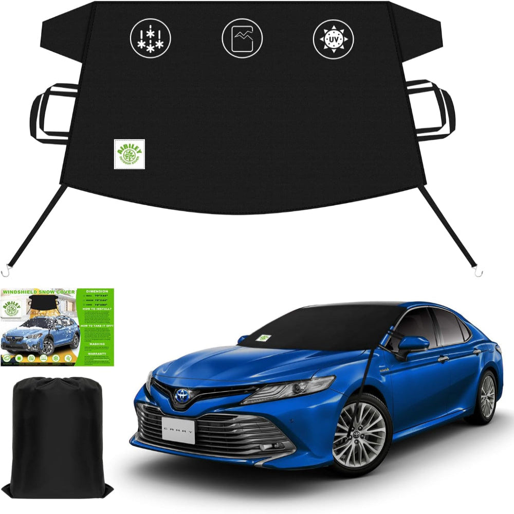 Car Windshield Cover – Ice & Snow Protection for Vehicles – Windproof Anti-Theft – 600D Waterproof Polyester - Keep your car windshield protected all winter with this heavy-duty windshield cover, crafted from durable 600D Polyester Oxford Cloth for superior waterproof and frost resistance. It fits most cars, SUVs, trucks, and vans, providing full coverage against ice, snow, and frost. The windproof design with anti-theft straps ensures the cover stays securely in place during harsh weather, while the easy-install system allows you to set it up or remove it in seconds. Lightweight yet robust, it’s perfect for preserving your windshield, saving time on scraping ice, and preventing damage from snow buildup. The sleek black finish complements any vehicle while offering long-lasting protection and versatility throughout the winter season.