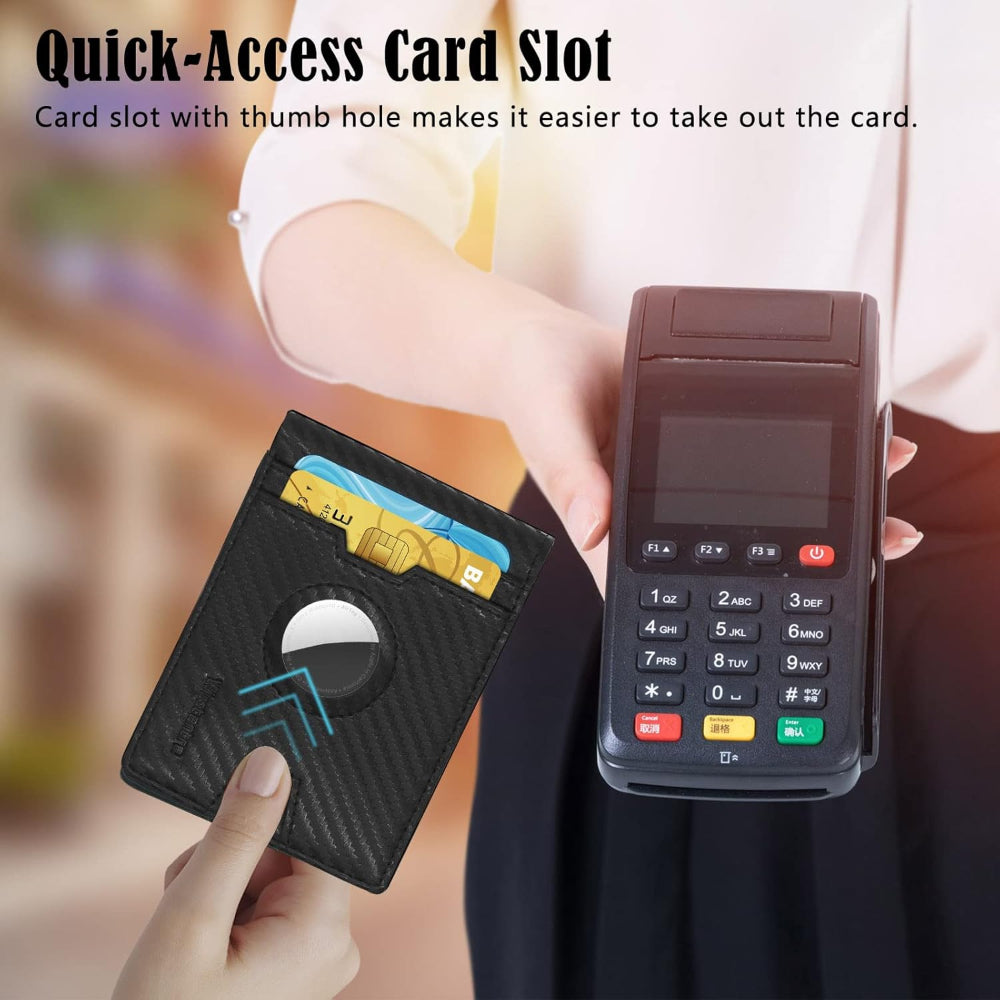 Slim RFID Blocking Bifold, Front Pocket Card Holder - GPS Tag Compatible - Keep your essentials secure and easy to track with this slim AirTag wallet designed for modern everyday carry. Featuring a built-in holder for an AirTag device, it allows you to locate your wallet quickly using compatible tracking technology. The minimalist bifold design fits comfortably in front or back pockets while still holding multiple credit cards and cash. Made from durable PU leather material, it offers a sleek appearance with long-lasting performance. Integrated RFID blocking technology helps protect your cards from unauthorized scanning and digital theft. Perfect for travel, daily use, and minimalist carry, this wallet combines smart tracking convenience with reliable security.