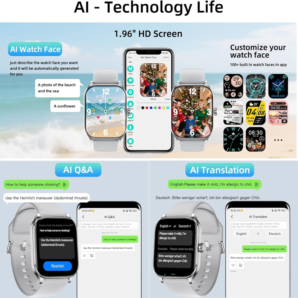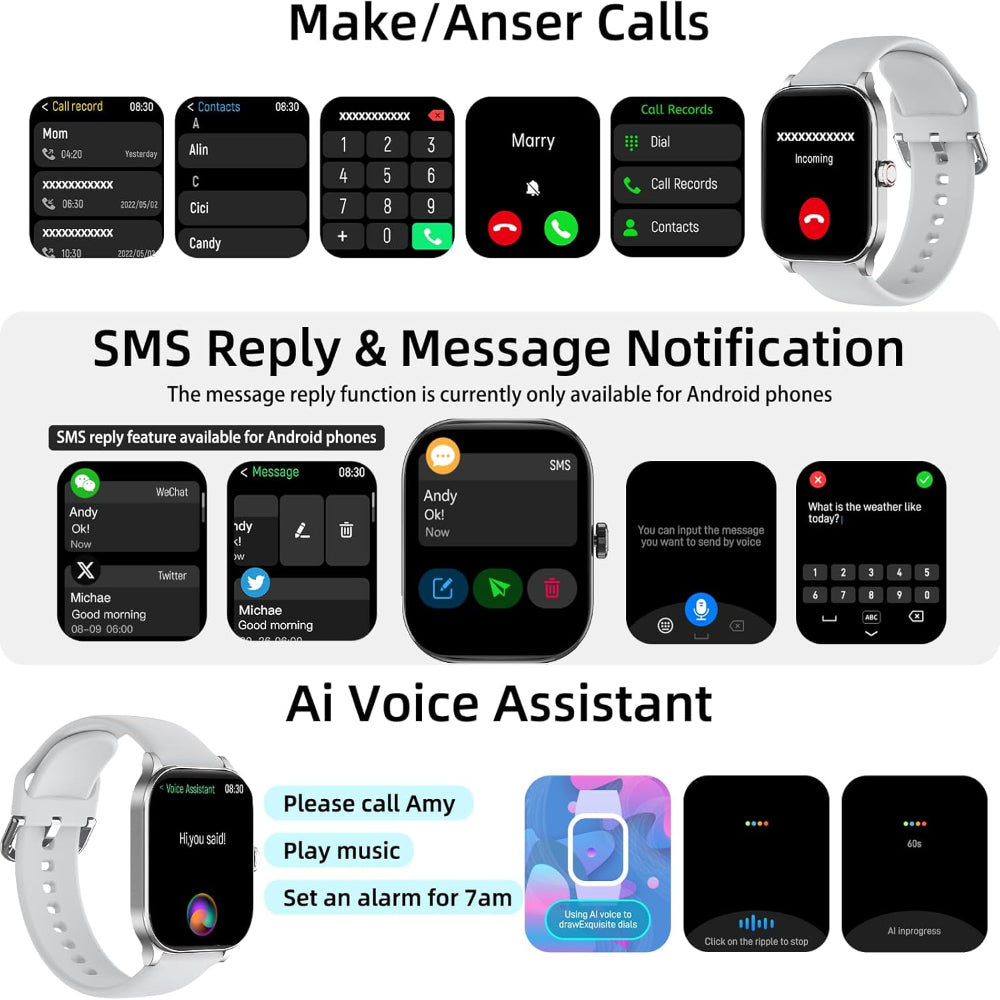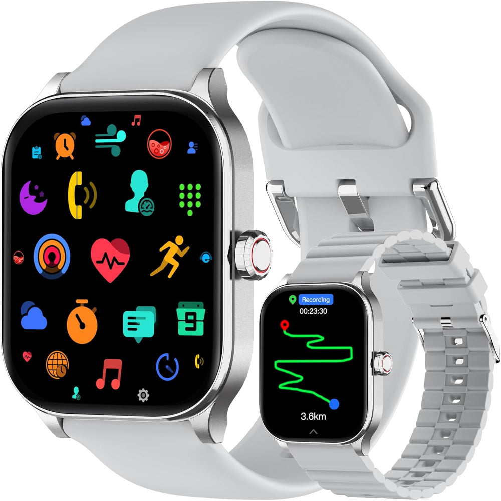 Smart Watch Fitness Tracker with GPS Bluetooth Calling - 1.96 Inch Display for Android and iPhone - Stay connected and track your health with this smart watch fitness tracker designed for everyday performance and convenience. Featuring a large 1.96 inch HD display, it provides clear visuals for notifications, workouts, and health data at a glance. Built in GPS and Bluetooth calling allow you to track routes and answer or make calls directly from your wrist without needing your phone. With over 100 sport modes, this watch supports a wide range of activities while monitoring heart rate, sleep patterns, and blood oxygen levels for complete health insights. Compatible with both Android and iPhone devices, it offers seamless connectivity for men and women alike. Durable, stylish, and easy to use, this all in one smartwatch is perfect for fitness tracking and daily lifestyle management.